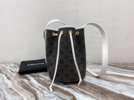 CELINE TRIOMPHE CANVAS SMALL DRAWLING BAG n6 X 8 X 6 INCHES (14 X 21 X 14 cm)n62% canvas, 38% calfskin leathernCrossbody & ShouldernDrawstring Leather StrapnAdjustable Leather Shoulder Strap 20 inches (50 cm)nNo. 191142BZJ.04LUp550