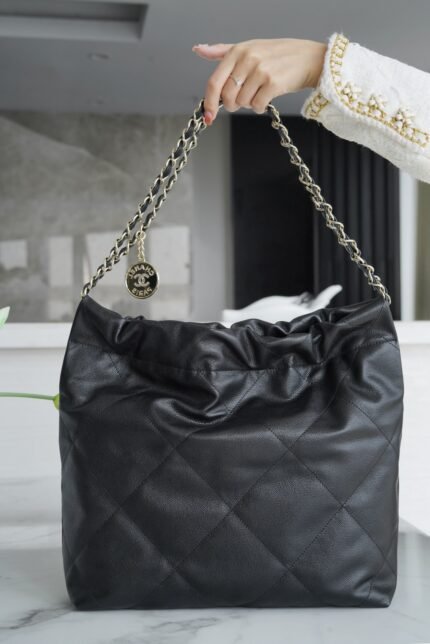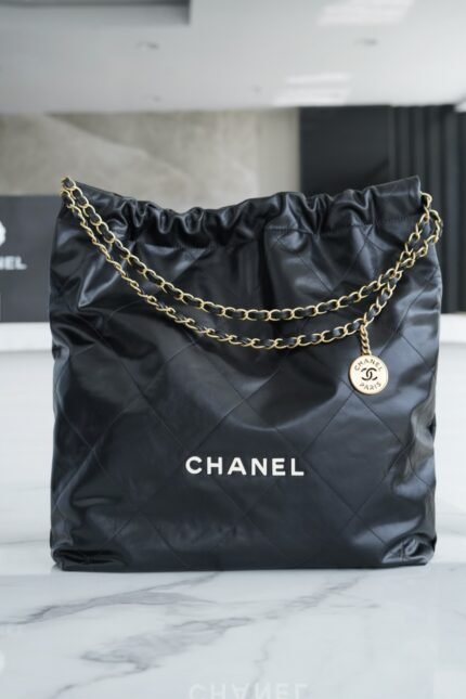 𝗖𝗛𝗔𝗡𝗘𝗟 23ᴄ Spring/Summer New 𝟐𝟐 Handbag Medium Black Gold White line➿nn glossy cowhide leather is smooth on the hand There is a clear leather fold texturen aged metal, three-dimensional Logo, classic black and gold color scheme! nThe top drawstring double chain design with double C Logo connected to the lower half of the single chain, the bottom of the left and right each a small ear with Logo “rivets” to fix the end of the single chain, the inside has a zipper compartment a key chain convenient to hang keys and other small objects … will be simple and comfortable as one, for you to pack the whole spring 🍃! nnSize: 39*42*8cmn 🔍: 22610561
