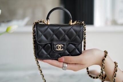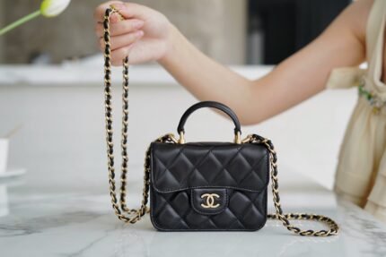 𝖢𝗁𝖺𝗇𝖾𝗅 ❥𝟚𝟘𝟚1 Haute Couture Handle Coin Purse Black nnClassic diamond check pattern and mouth flap design, the metal is vintage old sand gold, in line with this season’s ‘Renaissance’ theme ✿, round leather handle, line design is excellent ✓ can be shoulder slanting, crossbody handheld, a small one, simply adorable to explode 🍥nnSize: 9.5 x12.5×3.5cmn 🔍: B21100570