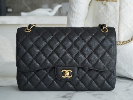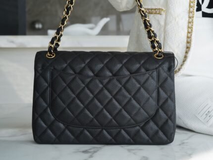 ℂ𝔽 𝗖𝗹𝗮𝘀𝘀𝗶𝗰 𝗙 𝗹𝗮𝗽 𝐉𝐮𝐦𝐛𝐨 :Caviar Black Gold nn French 🇫 🇷 Channel customized caviar calf leather, fashionable and practical at the same time. The body of the bag is quite broad diamond lattice full, ten years of pure handmade a needle and thread perfect presentation. nnSize: 30cm n🔍: 586000571