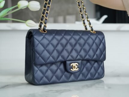 ℂ𝔽 𝗖𝗹𝗮𝘀𝘀𝗶𝗰𝗙 𝗹𝗮𝗽 |Original Lycra 🐂 Medium Dark Blue n n France 🇫🇷 𝐇𝐚 𝐚𝐬 original lychee grain 🐂, grain feel color is the best on earth, eleven years of pure handmade staple classic models, the front flap and the body of the bag alignment fits perfectly, the bag edge diamond grid is exactly 1/2, strive for excellence to present you with the charm of the genuine! nn Size: 𝟐𝟓𝐜𝐦n 🔍: 11120802