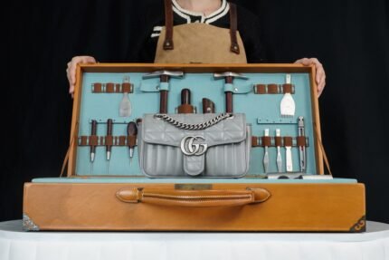 𝐆𝐆𝐌𝐚𝐫𝐦𝐨𝐧𝐭 Geometrics Collection Dark Gray Mininn The “Aria – Fashion Aria” collection continues to boldly explore the brand’s classic symbolic elements. As part of Gucci’s Favorite Selection of Handbags, the GG Marmont collection is revered for its signature quilted leather and double G monogrammed interwoven accessories. On this mini shoulder bag, the classic material is incorporated with vertical and twill patterns to create a distinctive geometric style design. nSize: 22*13*6cmn🔍: 4467440590