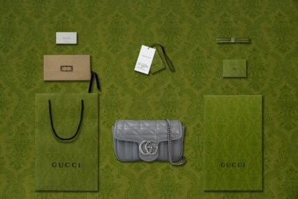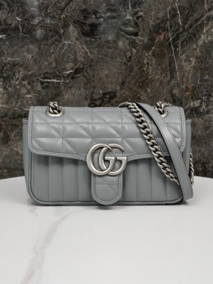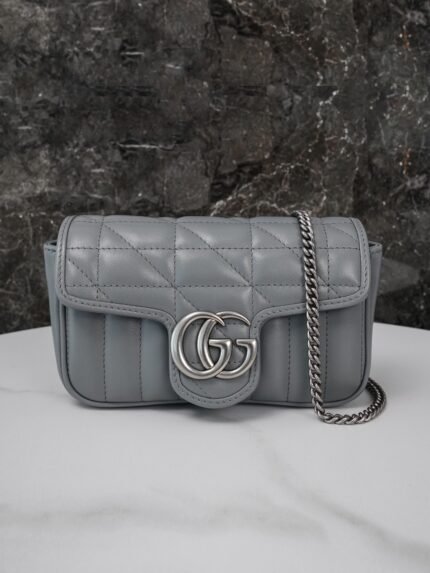 𝐆𝐆𝐌𝐚𝐫𝐦𝐨𝐧𝐭 Geometrics Ultra Mini Gray nn A classic accessory that illustrates the brand’s visionary design through its ultra-miniature design. This shoulder bag is a stunning addition to the GG Marmont collection, incorporating interwoven double G fittings and quilting, using a combination of diagonal and vertical stripes to reinterpret classic quilting elements. The Double G fittings from the 70’s are designed in antique silver tones, complementing the gray leather. nSize: 16.5*10*4.5cmn🔍: 4764330560