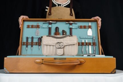 𝐆𝐆𝐌𝐚𝐫𝐦𝐨𝐧𝐭 Geometric Collection Beige Mini nn The Aria – Fashion Aria” collection continues to boldly explore the brand’s classic symbolic elements. As part of Gucci’s Favored Handbags selection, the GG Marmont collection is revered for its signature quilted leather and double G monogrammed interwoven accessories. On this mini shoulder bag, the classic material is incorporated with vertical and twill patterns to create a distinctive geometric style design. nSize: 22*13*6cmn🔍: 4467440590