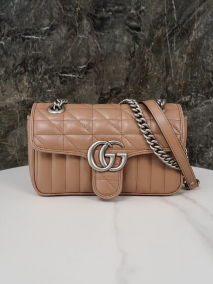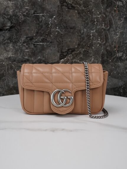 𝐆𝐆 𝐌𝐚𝐫𝐦𝐨𝐧𝐭 Geometrics Super Mini Rose Beige n n’s classic accessory is a miniature interpretation of the brand’s visionary design. This shoulder bag is a stunning addition to the GG Marmont collection, incorporating interwoven double G fittings and quilting, using a combination of diagonal and vertical stripes to reinterpret classic quilting elements. The Double G fittings from the 70’s are designed in antique silver tones, complementing the rose beige leather. nSize: 16.5*10*4.5cmn🔍: 4764330560