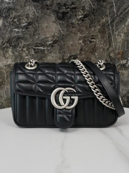𝐆𝐆 𝐌𝐚𝐫𝐦𝐨𝐧𝐭 Geometrics Ultra Mini Black nn A classic accessory that illustrates the brand’s visionary design through its ultra-miniature design. This shoulder bag is a stunning addition to the GG Marmont collection, incorporating interwoven double G fittings and quilting, using a combination of diagonal and vertical stripes to reinterpret classic quilting elements. The Double G fittings from the 70’s are designed in antique silver tones, complementing the black leather. nSize: 16.5*10*4.5cmn🔍: 4764330560
