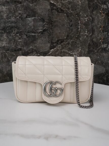 𝐆𝐆 𝐌𝐚𝐫𝐦𝐨𝐧𝐭 Geometrics Ultra Mini White nn A classic accessory that illustrates the brand’s visionary design through its ultra-miniature design. This shoulder bag is a stunning addition to the GG Marmont collection, incorporating interwoven double G fittings and quilting, using a combination of diagonal and vertical stripes to reinterpret classic quilting elements. The Double G fittings from the 70’s are designed in antique silver tones, complementing the white leather. nSize: 16.5*10*4.5cmn🔍: 4764330560