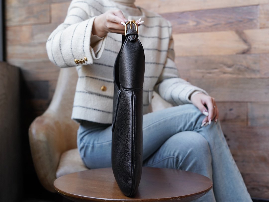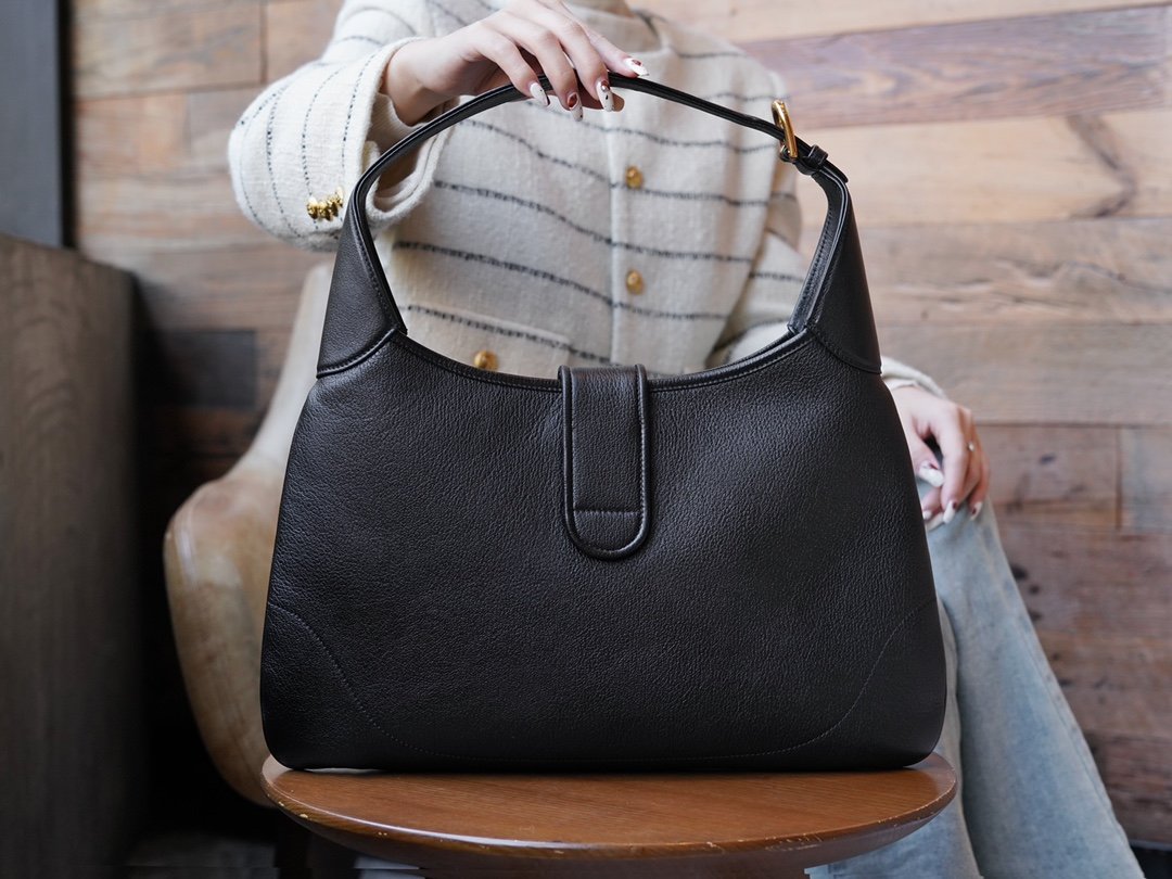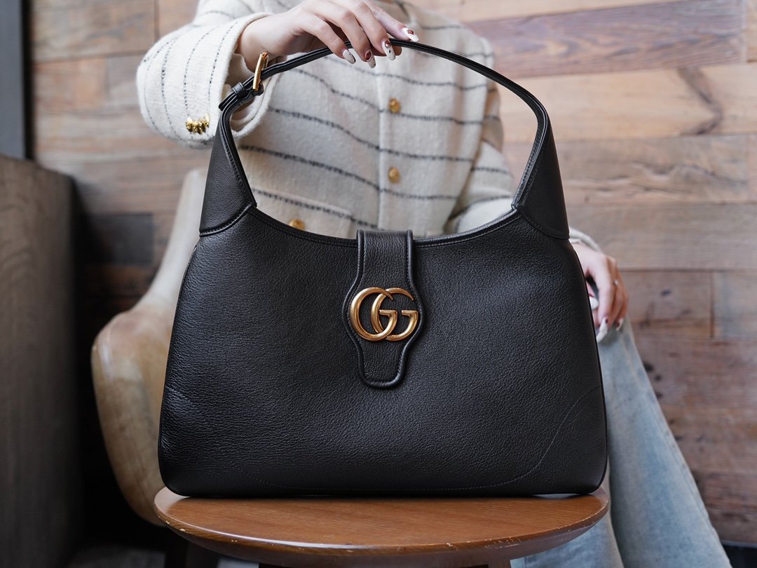 𝐀𝐩𝐡𝐫𝐨𝐝𝐢𝐭𝐞 Collection Medium Crescent Bag Black nn The Gucci Cosmogonie collection was unveiled at the historic Castello di Monte in Italy. The show was a mix of aesthetics from different eras and geographic locations, connecting the past with the present. One of the show pieces was this new crescent-shaped shoulder bag, inspired by elements of the brand’s collection, presented in supple leather and adorned with the double G logo that was unveiled in the 1970s. nSize: 39*38*2cmnModel No.: 726274