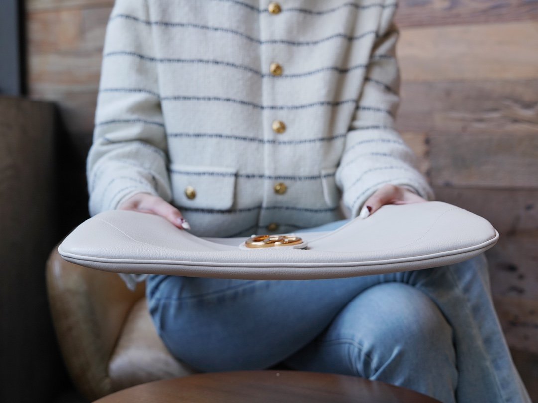 𝐀𝐩𝐡𝐫𝐨𝐝𝐢𝐭𝐞 Collection Medium Crescent Bag White nn The Gucci Cosmogonie collection was unveiled at the historic Castello di Monte in Italy. The show was a mix of aesthetics from different eras and geographic locations, connecting the past with the present. One of the show pieces was this new crescent-shaped shoulder bag, inspired by elements of the brand’s collection, presented in supple leather and adorned with the double G logo that was unveiled in the 1970s. nSize: 39*38*2cmnModel No.: 726274