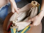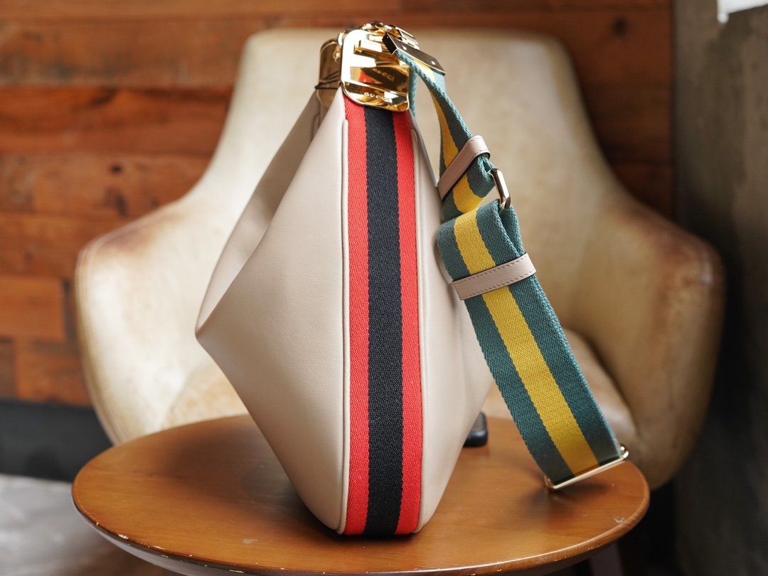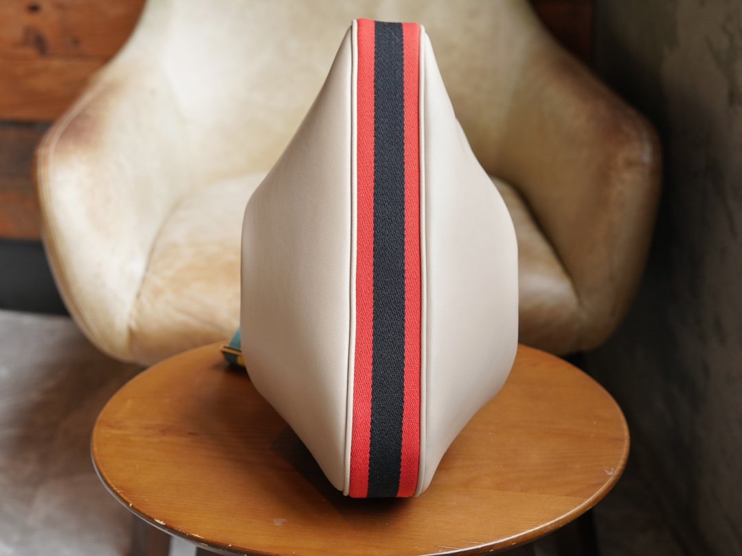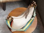 n Refreshingly reinterpreted, this accessory pays homage to the timeless glamour of Hollywood. This accessory features a recognizable crescent moon shape and a G-hook closure for a unique design aesthetic. Classic accessories are combined with soft materials for a beautifully romantic take on vintage glamor. This oversized piece is crafted in oatmeal leather with orange and black webbing piping.