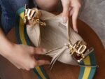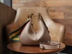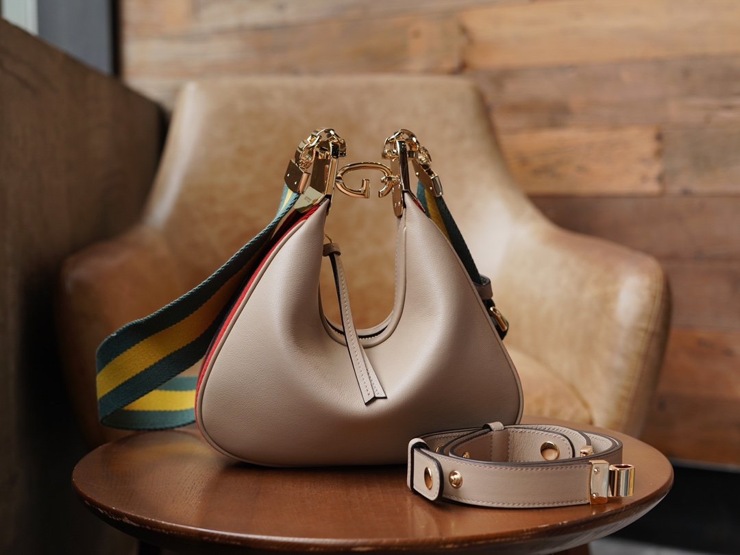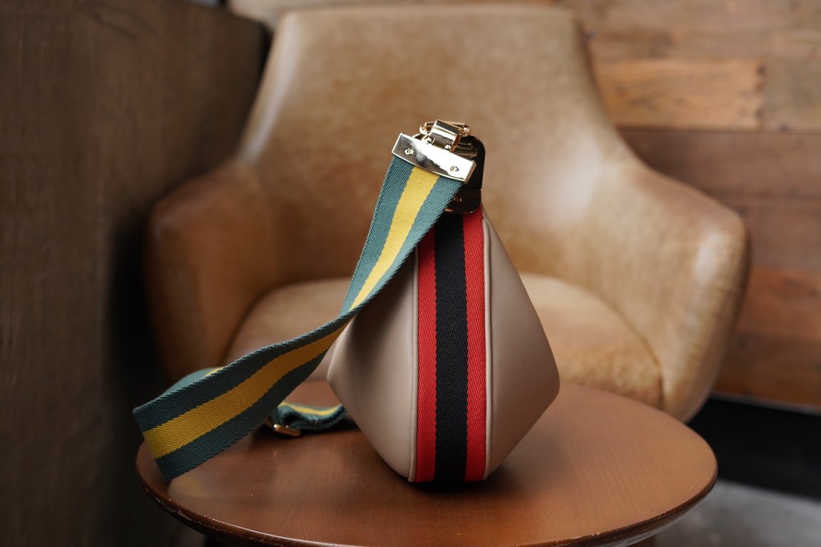n Refreshingly reinterpreted, this accessory pays homage to the timeless glamour of Hollywood. This accessory features a recognizable crescent moon shape and a G-hook closure for a unique design aesthetic. The combination of classic accessories and soft materials is a beautifully romantic take on vintage glamor. This small shoulder bag is made of oatmeal leather with orange and black webbing piping.