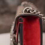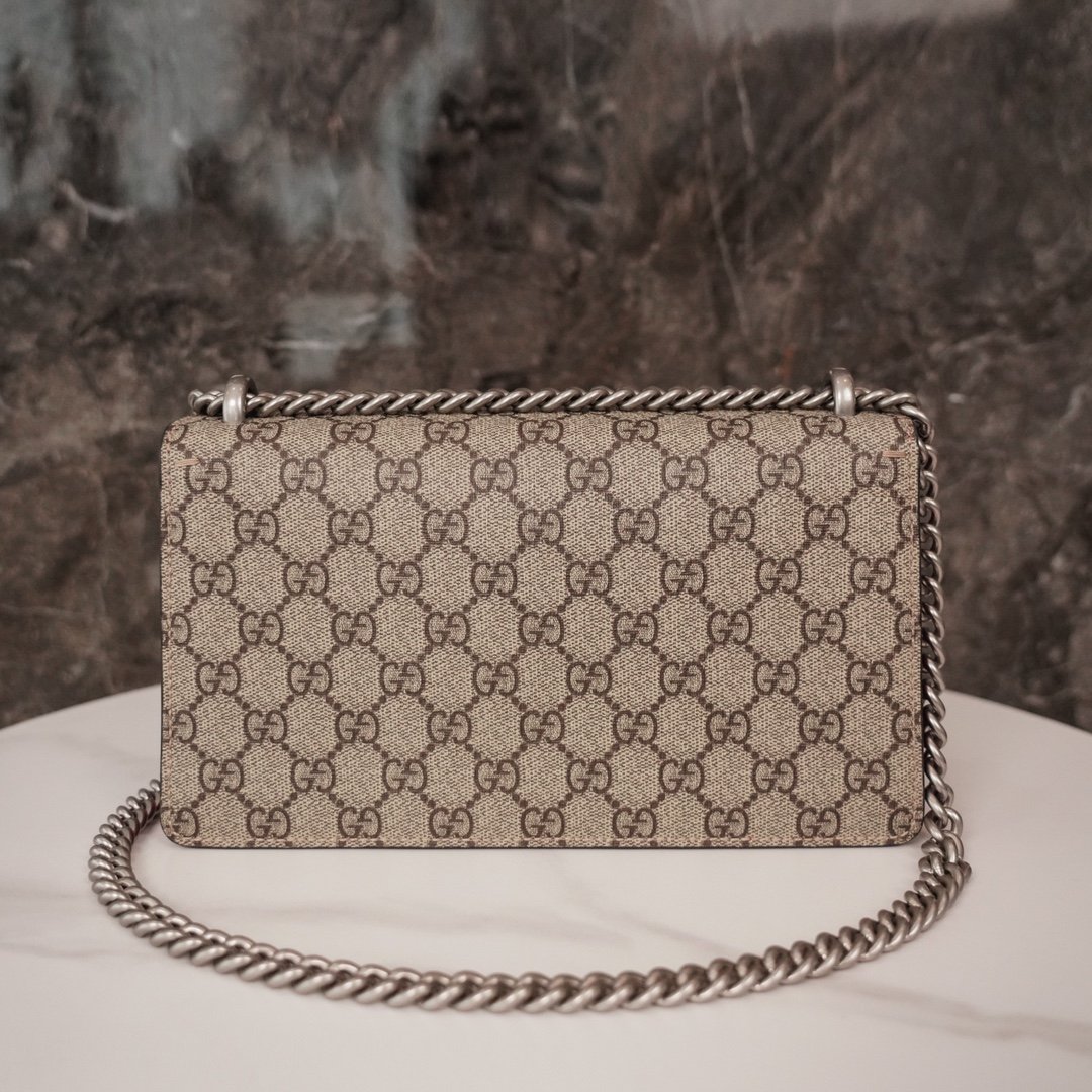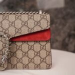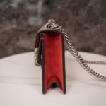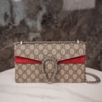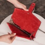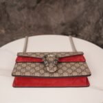 decorated with classic ๐๐๐๐๐๐ pattern and red suede piping details. The bag is embellished with the brand’s signature tiger head clasp, inspired by Dionysus, the Greek god of wine, who in myth and legend rode a tiger sent by Zeus across the Tigris River, and sparkling crystals that give the clasp a luxurious touch. The sliding chain strap creates a variety of carrying styles, which can be freely converted between a shoulder bag and a handbag.