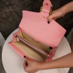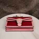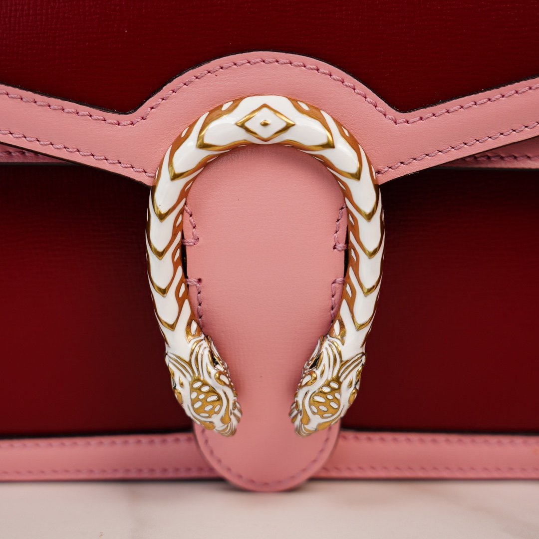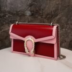 Classic styles are revitalized with vibrant and bright colorways. The classic Dionysus model has been reinterpreted in a bright and vibrant color palette, reminiscent of the beauty of precious stones. This Dionysus bag is crafted from ruby red leather and features the iconic tiger head closure in gold tone. Textured hardware and glittering enamel details emphasize the brand’s elegant and uncomplicated design style.