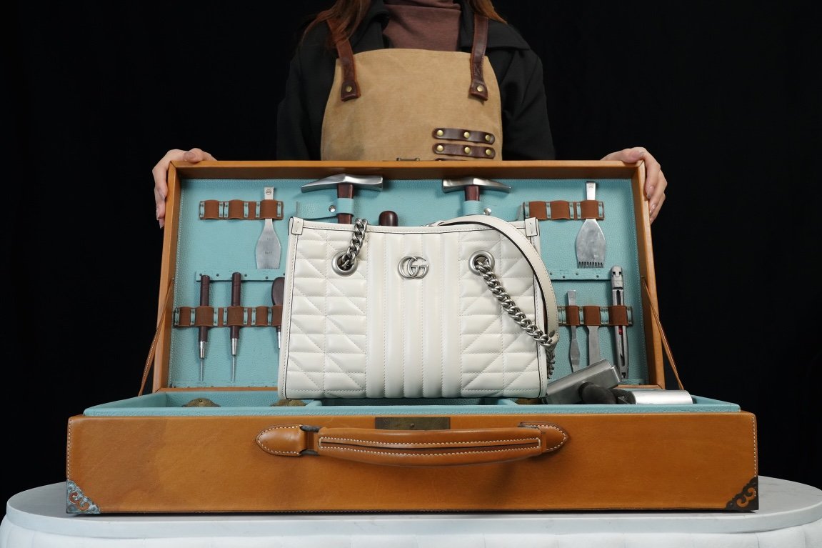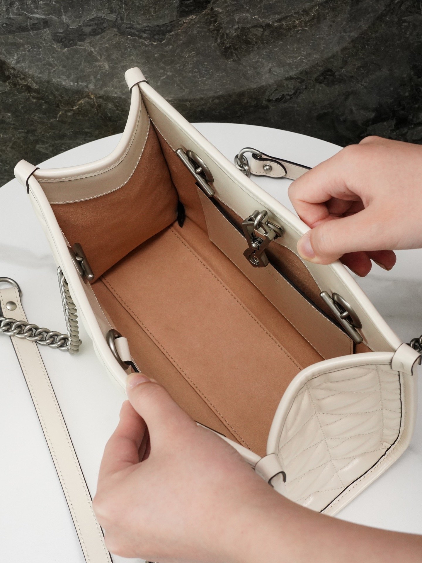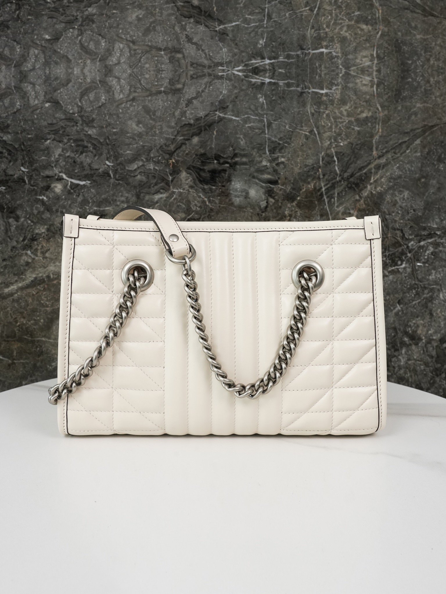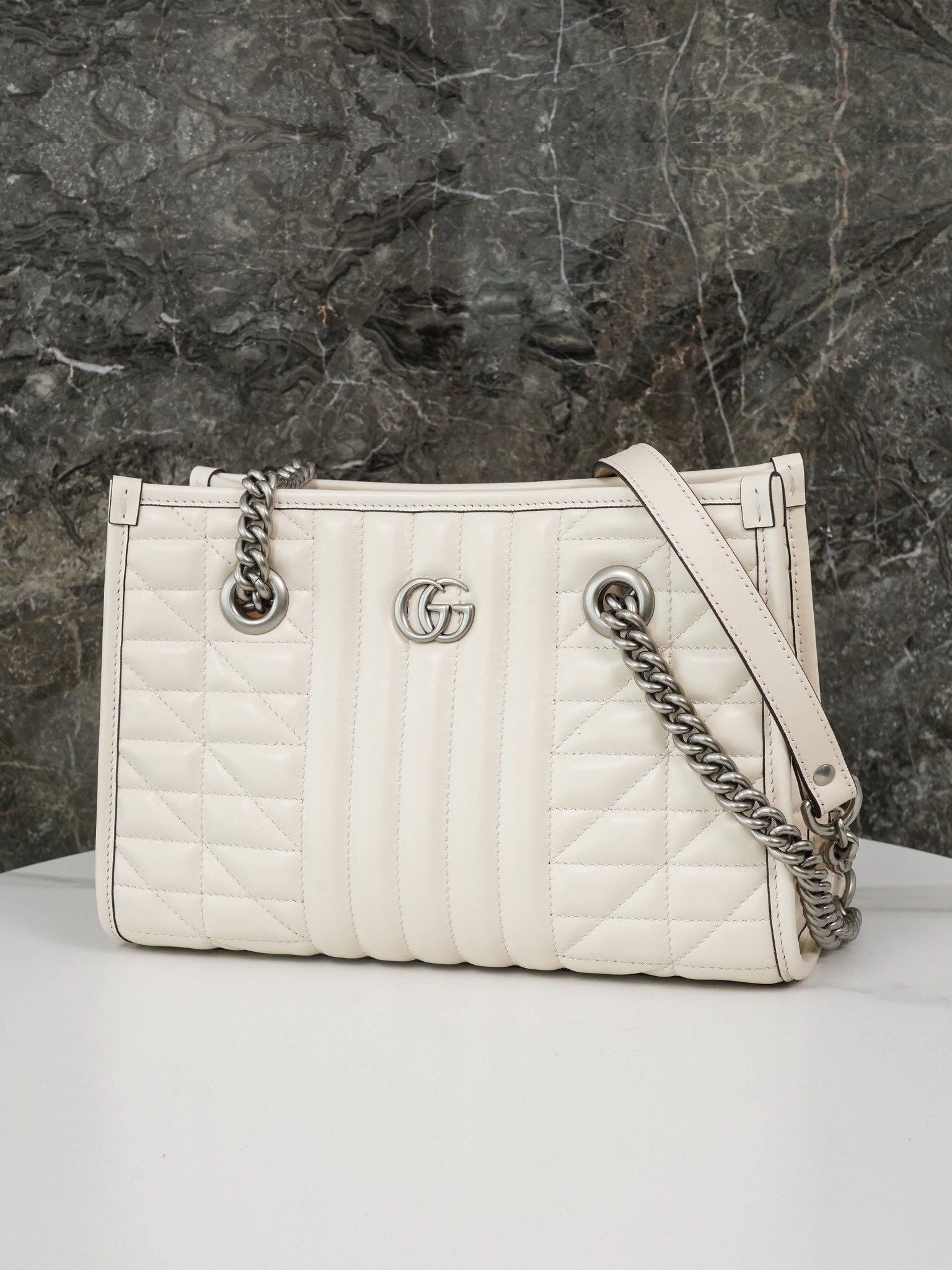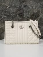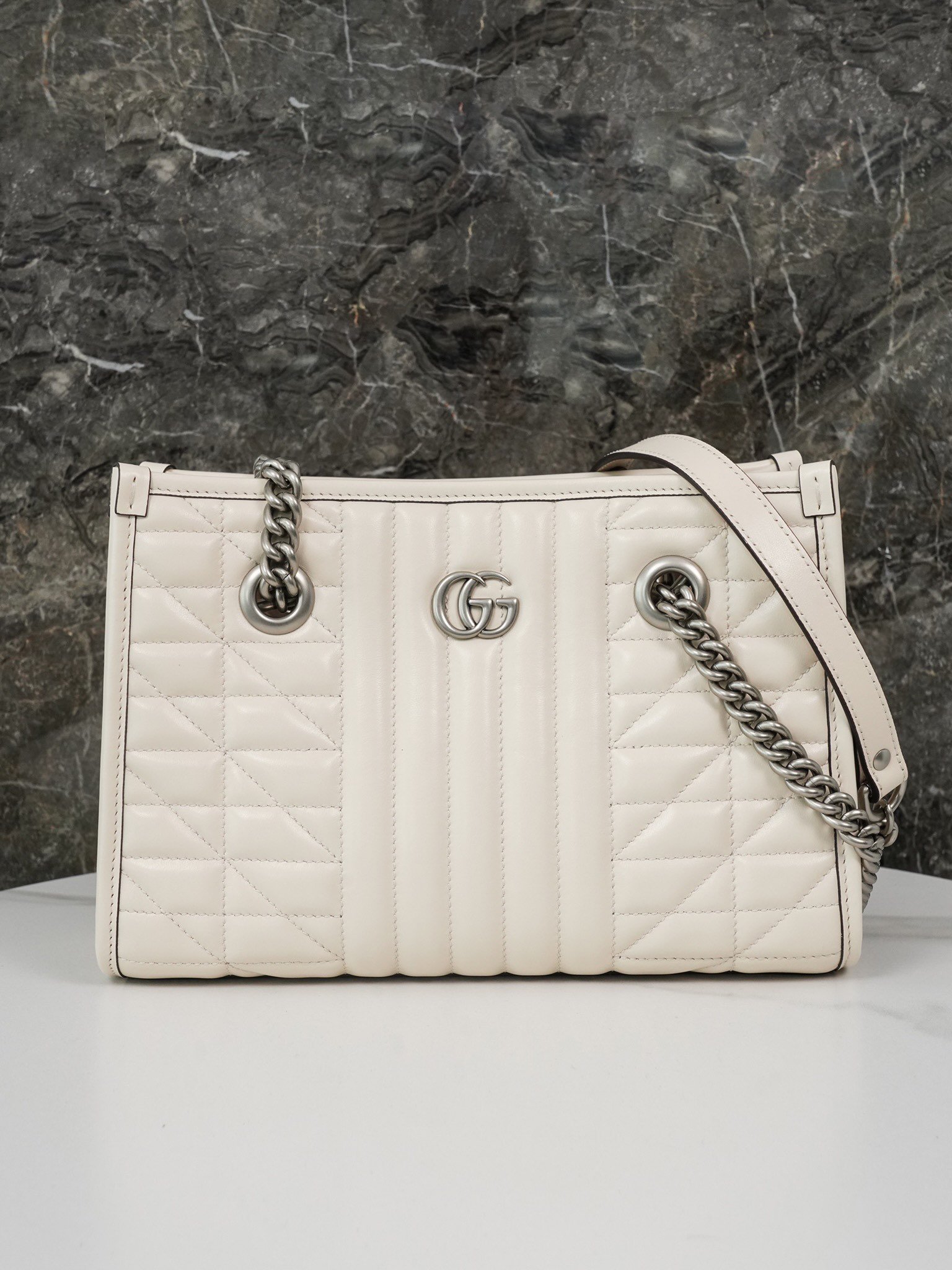𝐆𝐆𝐌𝐚𝐫𝐦𝐨𝐧𝐭 Geometric Collection White Tote Bagnn The Aria collection explores the House’s heritage and tells the story of Gucci’s design through a fusion of classic and modern. the GG Marmont collection, which was created during the Creative Director’s first years at the House, is updated each season with fresh perspectives. This tote bag is crafted in white quilted leather with vintage-inspired antique silver tone hardware. nSize: 26.5*19*11cmn🔍: 6814830590