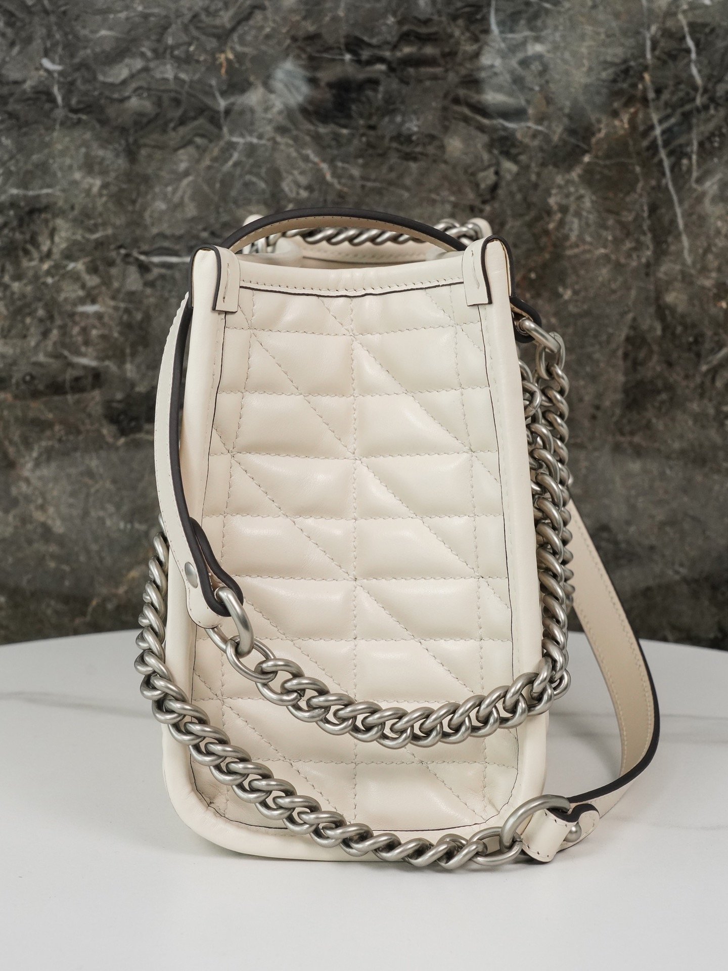 The Aria collection explores the House’s heritage and tells the story of Gucci’s design through a fusion of classic and modern. the GG Marmont collection, which was created during the Creative Director’s first years at the House, is updated each season with fresh perspectives. This tote bag is crafted in white quilted leather with vintage-inspired antique silver tone hardware.