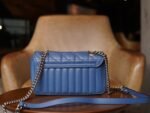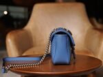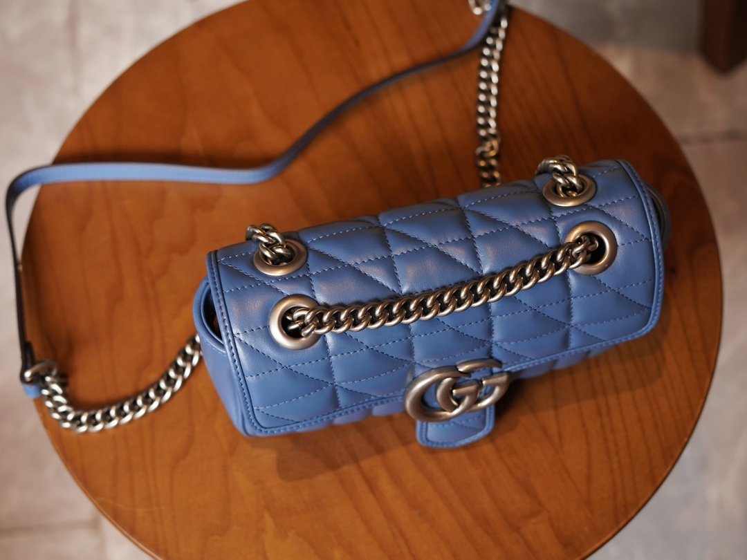 the new “Gucci Love March” fashion collection, the new blue hue is presented in two different geometric quilting patterns. The silver-colored double G accessories add glamour to the mini shoulder bag.