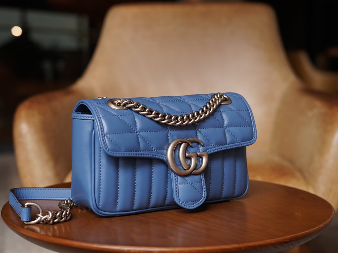 ๐†๐† ๐Œ๐š๐ซ๐ฆ๐จ๐ง๐ญ Geometric Collection Mini Blue n nGG Marmont pieces are revitalized with striking new shades and textures. A recognizable addition to the Gucci Favorites selection, highlights of the collection include double G accessories and quilted leather. n the new “Gucci Love March” fashion collection, the new blue hue is presented in two different geometric quilting patterns. The silver-colored double G accessories add glamour to the mini shoulder bag. nSize: 22*13*6cmnModel No.: 446744