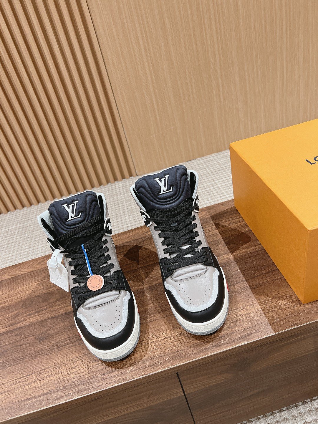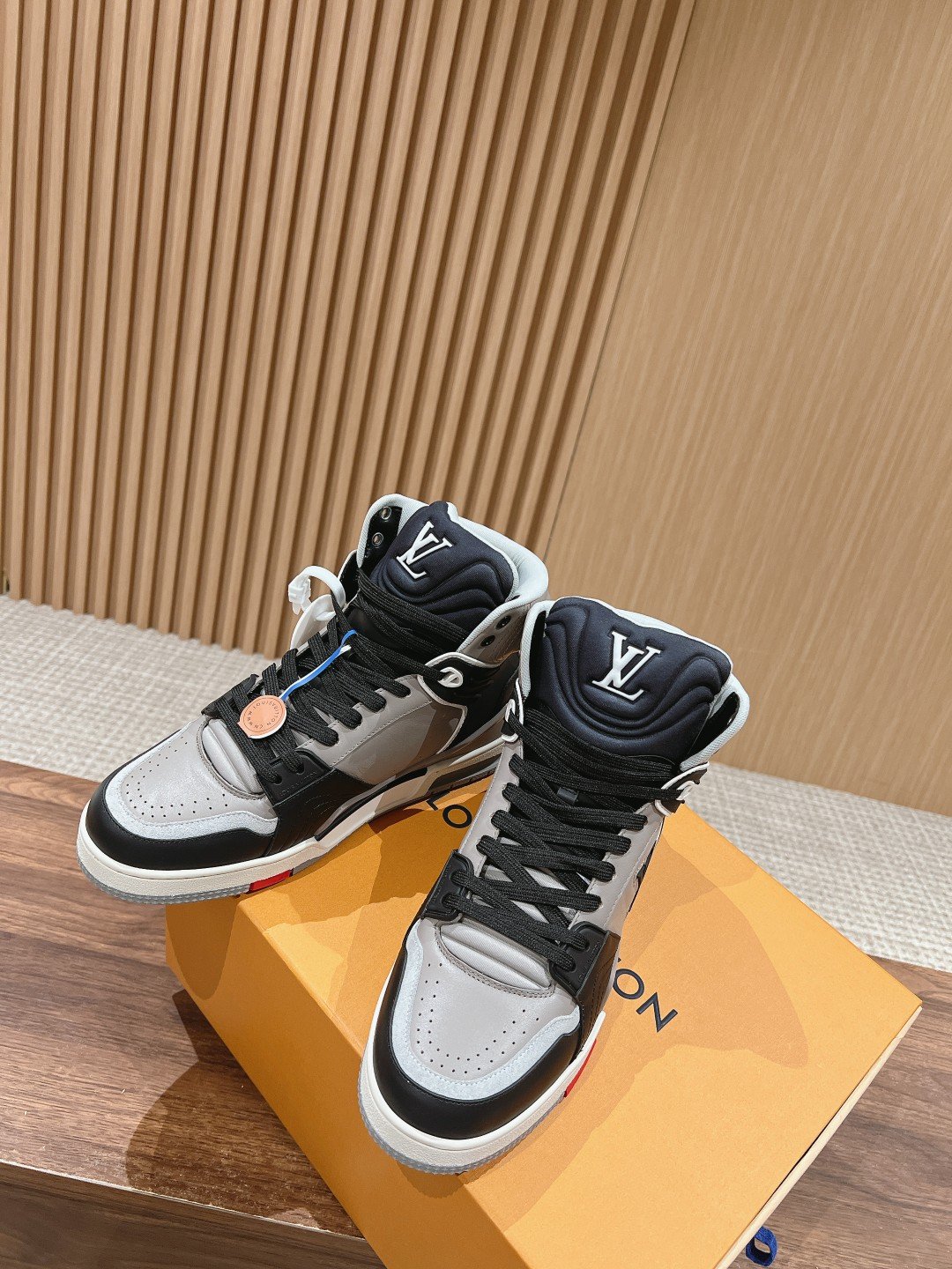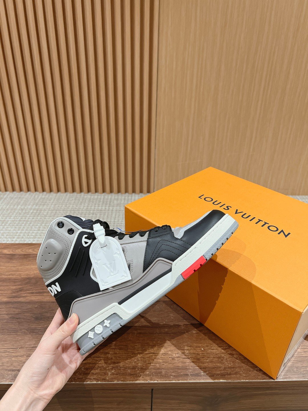 Home shoe LV Louis Vuitton ๐‹๐• ๐“๐ซ๐š๐ข๐ง๐ž๐ซ#High-top Louis Vuitton Runway New! Very comfortable on the foot Fine workmanship The upper is made of imported Italian calfskin splicing, the side is decorated with the brand LOGO logo and signature, cowhide cushion foot โž• mesh lining, the foot feels ultra-comfortable Original factory special original two-color TPU combination outsole set of package process Goodyear stitching lock edge nsize: 39-46 (45/46 customized non-returnable)