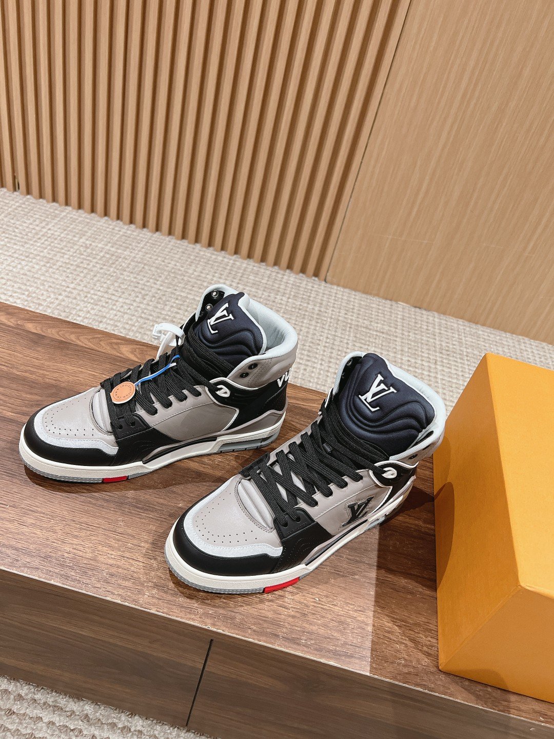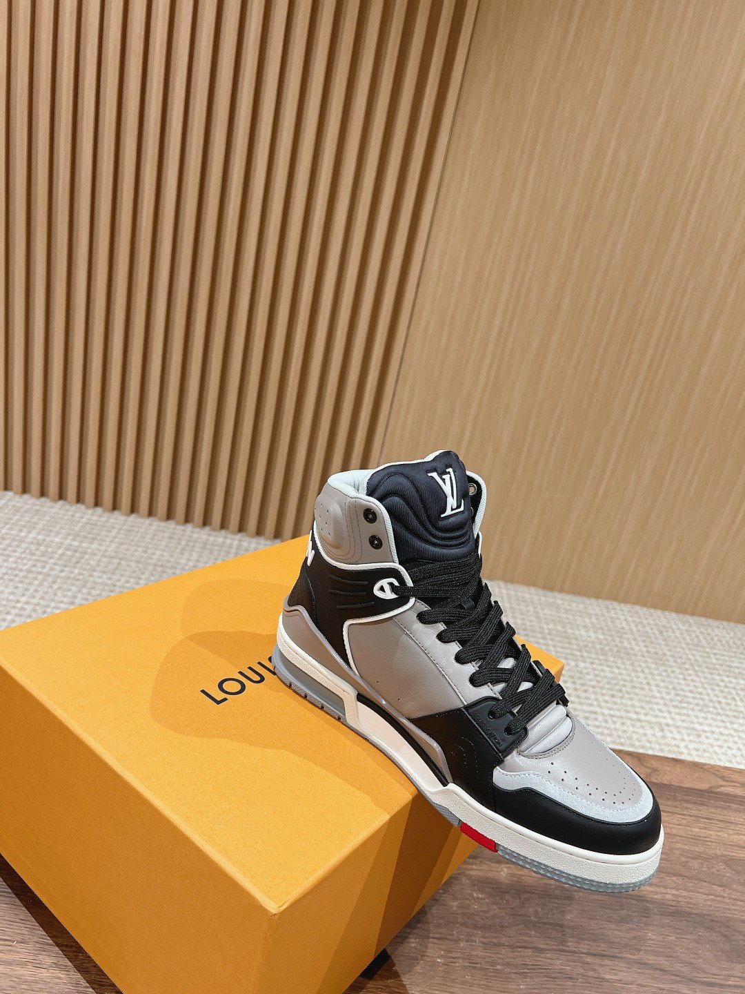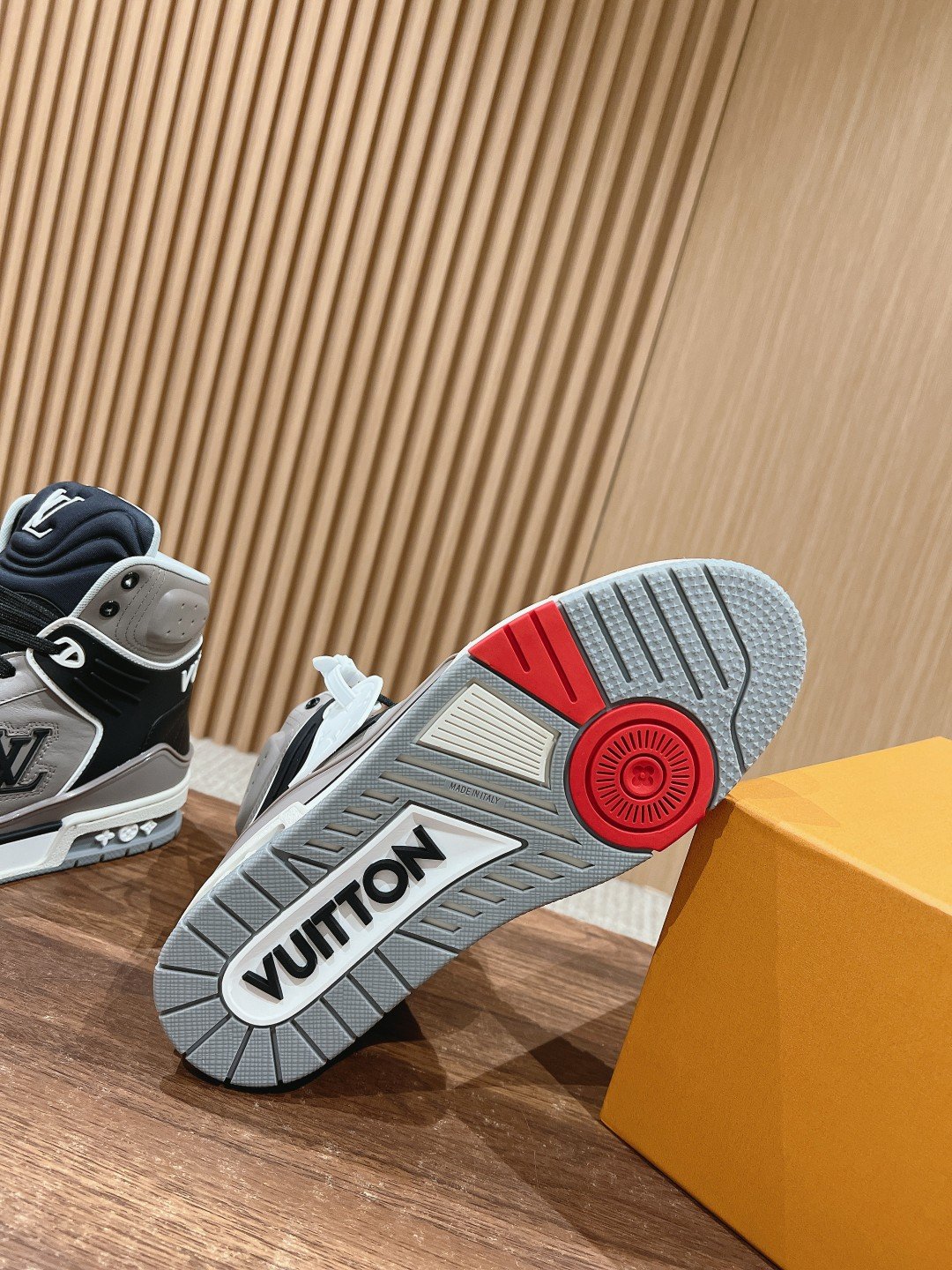 Home shoe LV Louis Vuitton ๐‹๐• ๐“๐ซ๐š๐ข๐ง๐ž๐ซ#High-top Louis Vuitton Runway New! Very comfortable on the foot Fine workmanship The upper is made of imported Italian calfskin splicing, the side is decorated with the brand LOGO logo and signature, cowhide cushion foot โž• mesh lining, the foot feels ultra-comfortable Original factory special original two-color TPU combination outsole set of package process Goodyear stitching lock edge nsize: 39-46 (45/46 customized non-returnable)