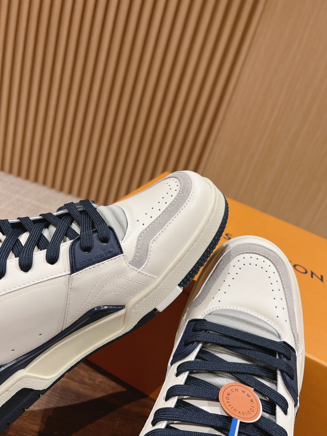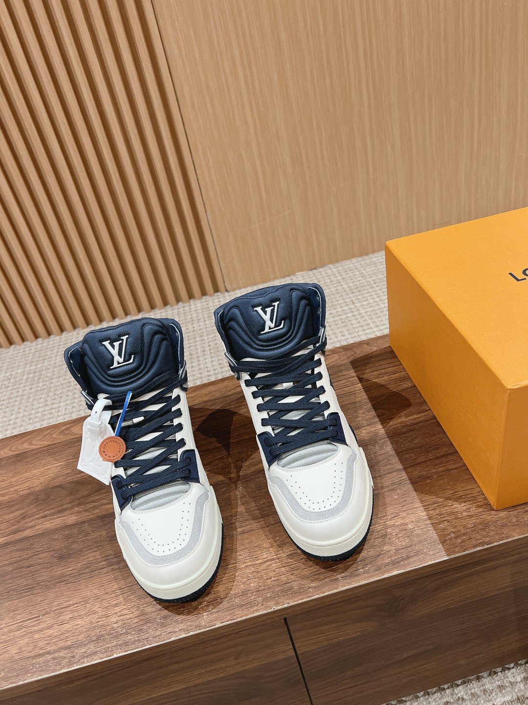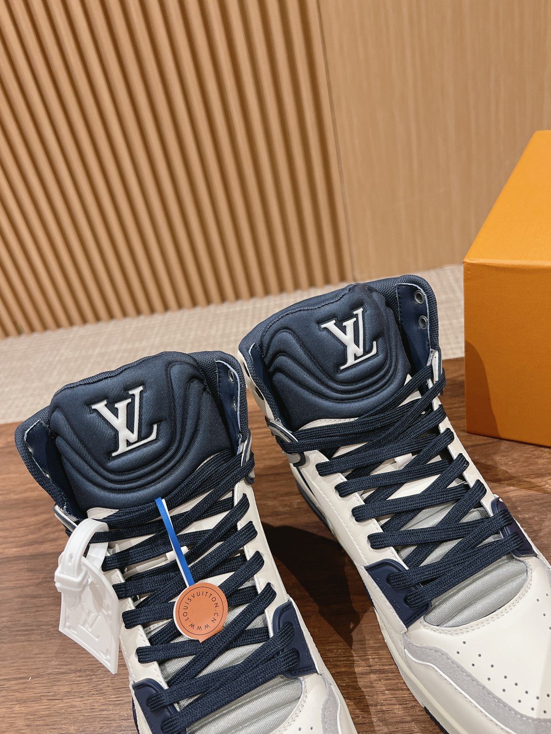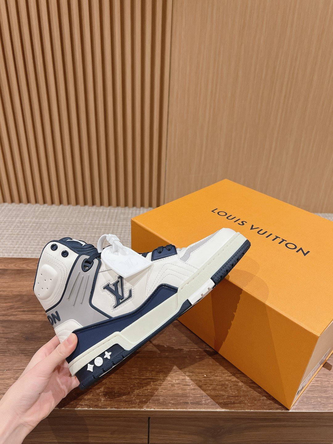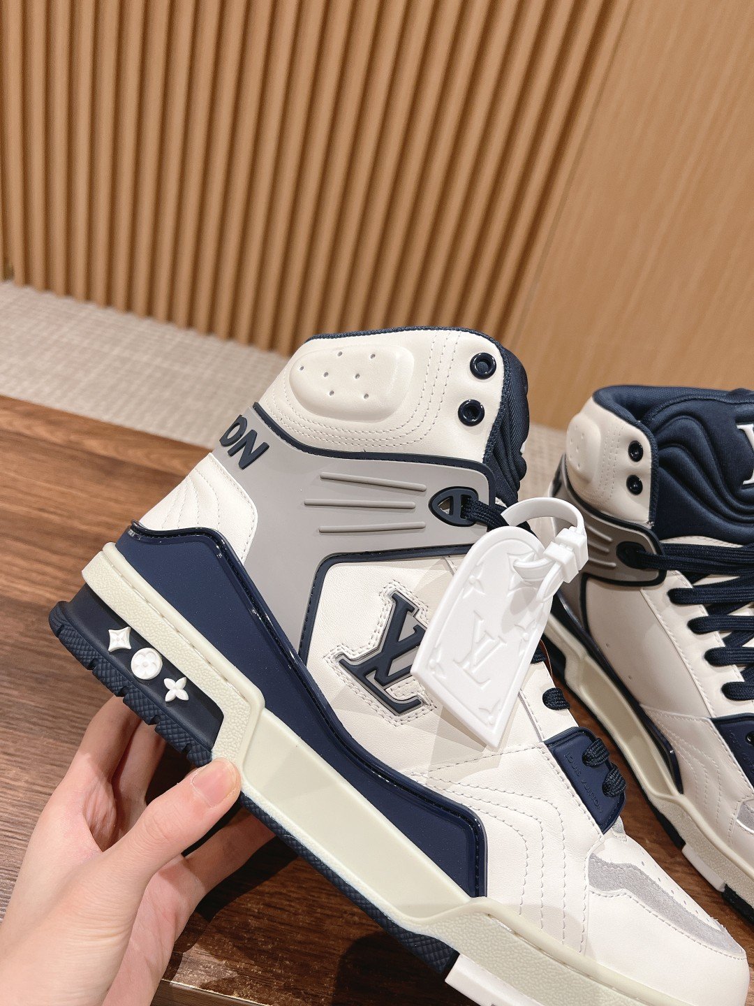 Home shoe LV Louis Vuitton ๐‹๐• ๐“๐ซ๐š๐ข๐ง๐ž๐ซ#High-top Louis Vuitton Runway New! Very comfortable on the foot Fine workmanship The upper is made of imported Italian calfskin splicing, the side is decorated with the brand LOGO logo and signature, cowhide cushion foot โž• mesh lining, the foot feels super comfortable Original factory special original two-color TPU combination outsole set of package process Goodyear stitching lock edge nsize: 39-46 (45/46 customized non-returnable)