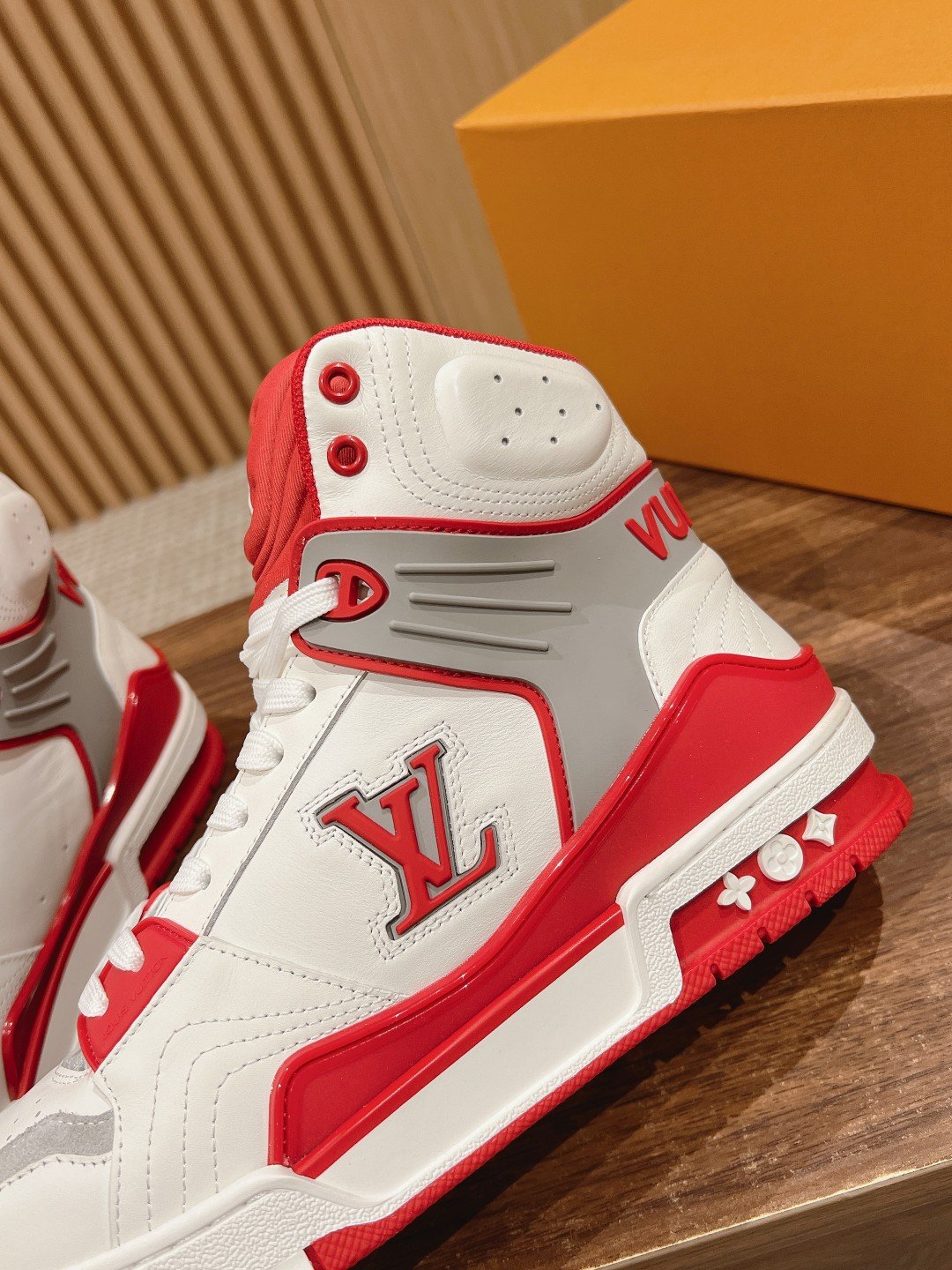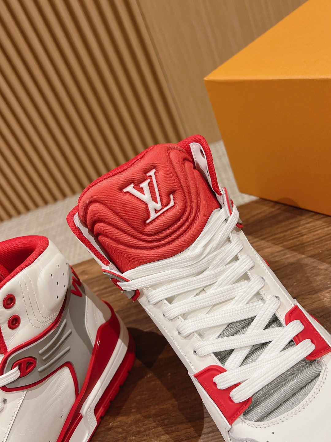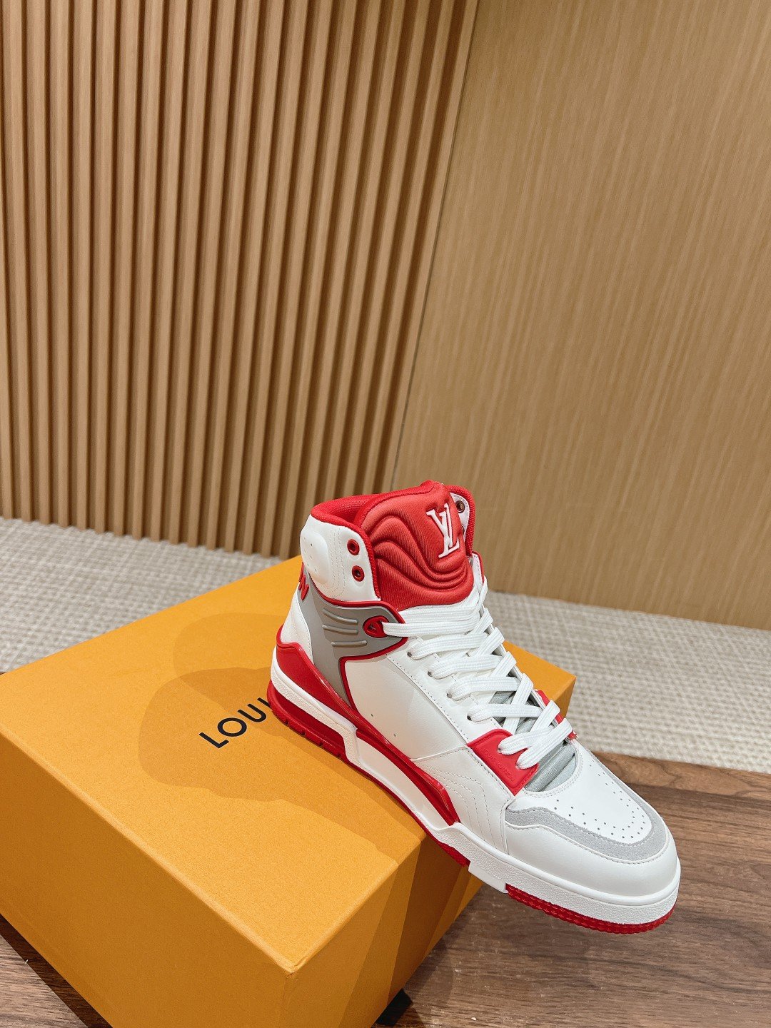Home shoe LV Louis Vuitton ๐‹๐• ๐“๐ซ๐š๐ข๐ง๐ž๐ซ#High-top Louis Vuitton Runway New! Very comfortable on the foot Fine workmanship The upper is made of imported Italian calfskin splicing, the side is decorated with the brand LOGO logo and signature, cowhide cushion foot โž• mesh lining, the foot feels ultra-comfortable Original factory special original two-color TPU combination outsole set of package process Goodyear stitching lock edge nsize: 39-46 (45/46 customized non-returnable)
