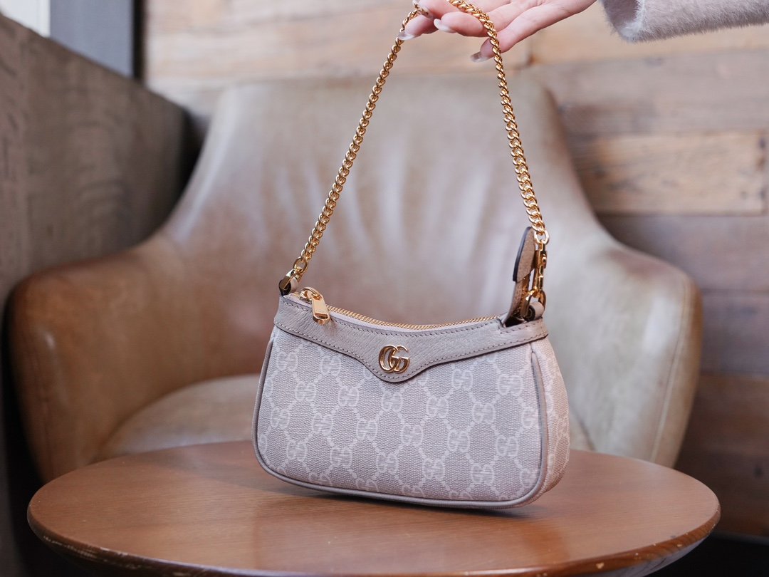 Home BAGS GUCCI 𝐎𝐩𝐡𝐢𝐝𝐢𝐚 Collection Mini Handbags The Oatmeal nnOphidia collection continues to evolve, with a variety of original shapes and materials. This mini handbag is crafted in beige and white GG Supreme canvas, subtly embellished with double G accessories. nSize: 10*19*3cmnModel No.: 764960