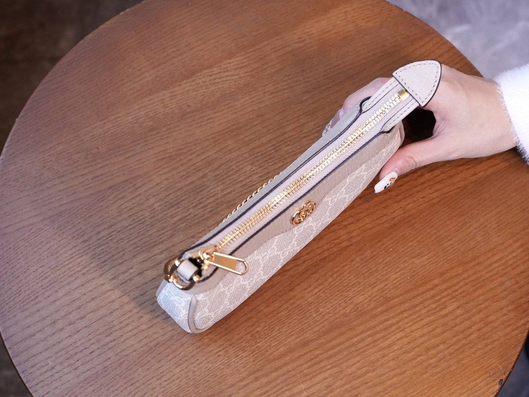 𝐎𝐩𝐡𝐢𝐝𝐢𝐚 Collection Mini Handbags The Oatmeal nnOphidia collection continues to evolve, with a variety of original shapes and materials. This mini handbag is crafted in beige and white GG Supreme canvas, subtly embellished with double G accessories. nSize: 10*19*3cmnModel No.: 764960