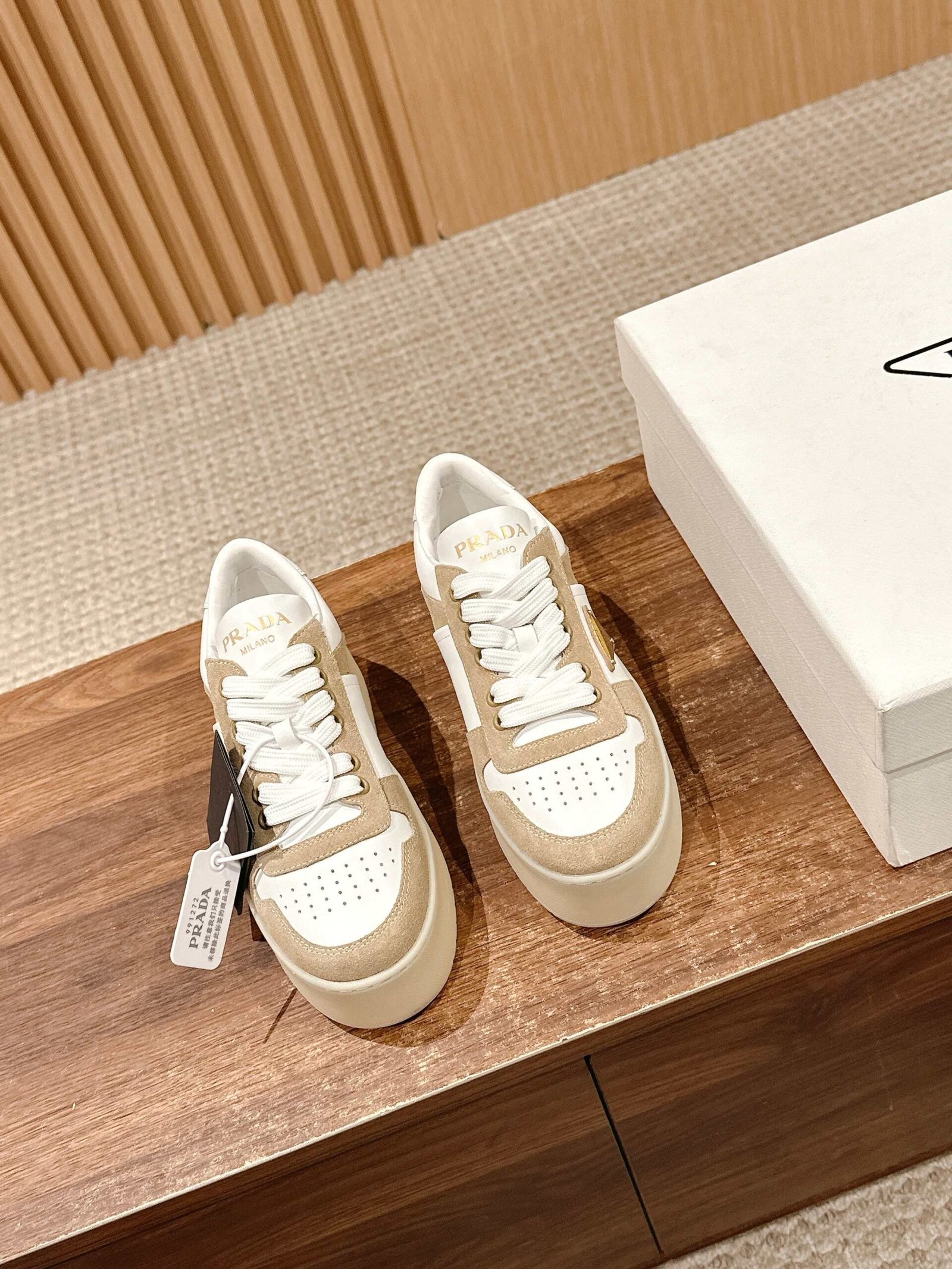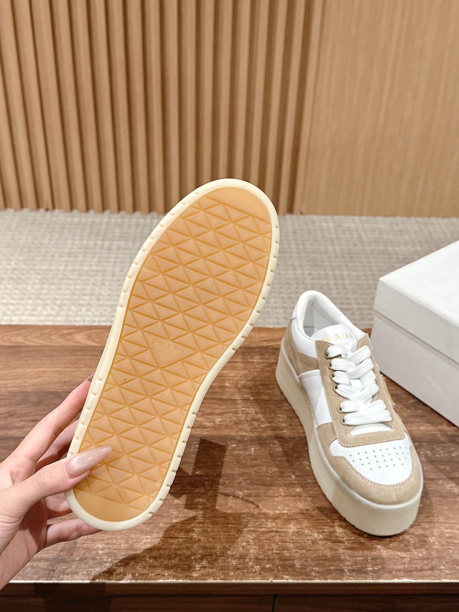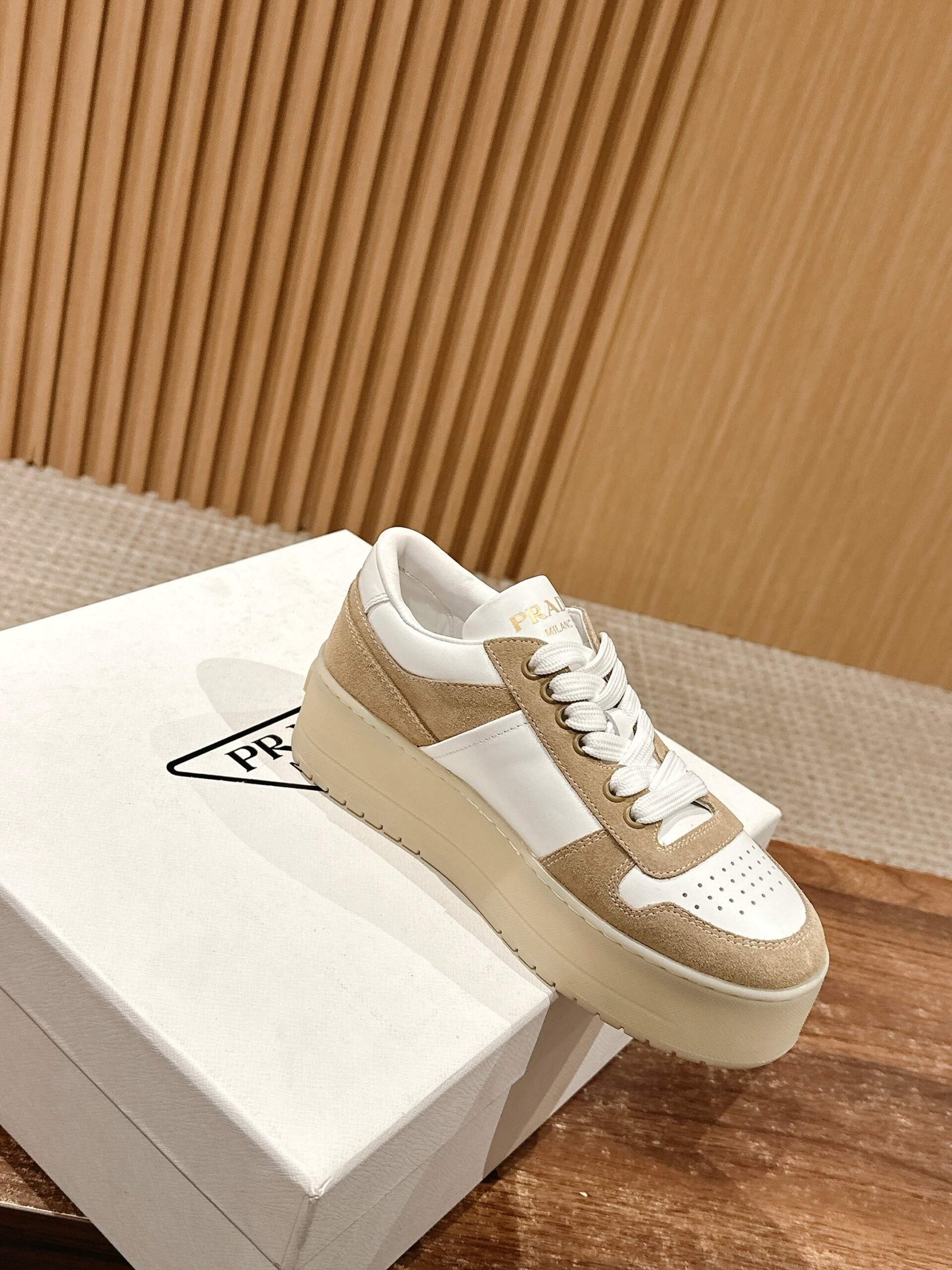 普拉达 春夏新款三角标厚底小白鞋休闲鞋nn麂皮和光面皮拼接撞色细节感跟好 三角标点缀简单高级关键上脚超显腿长轻松拉长腿部显腿nnSize 定做不退换