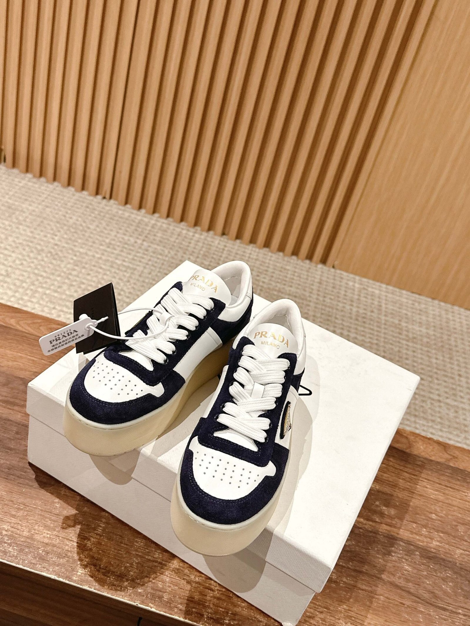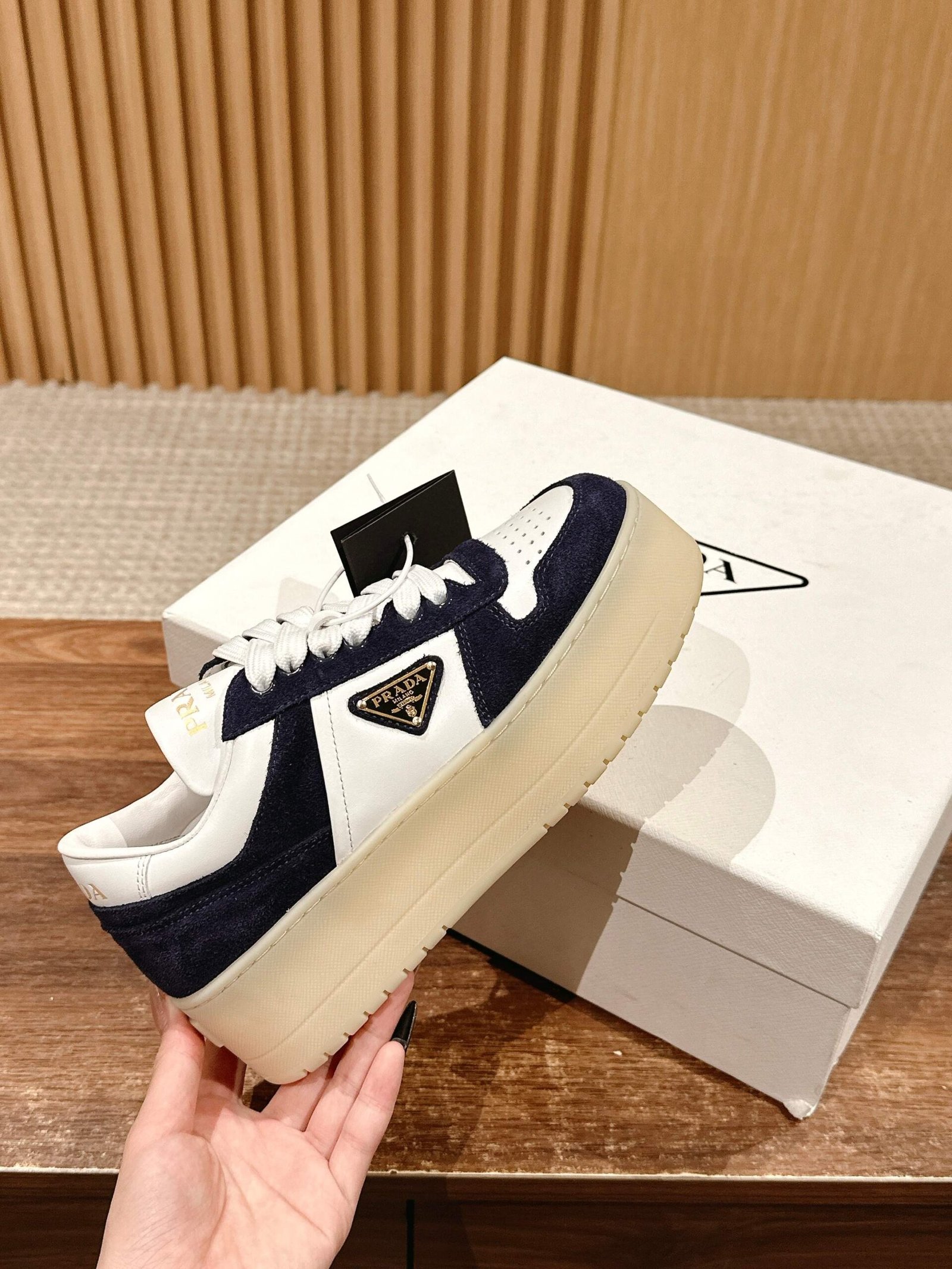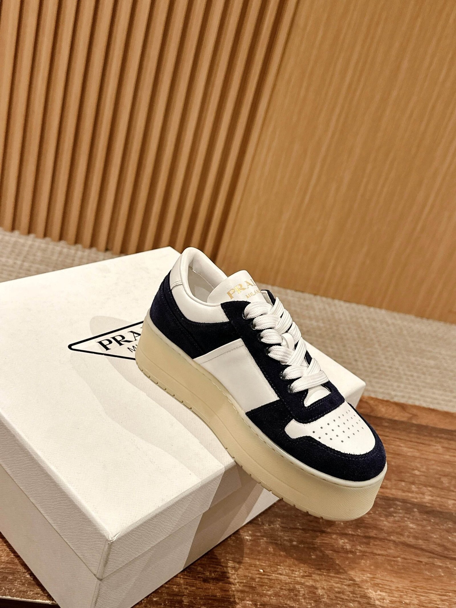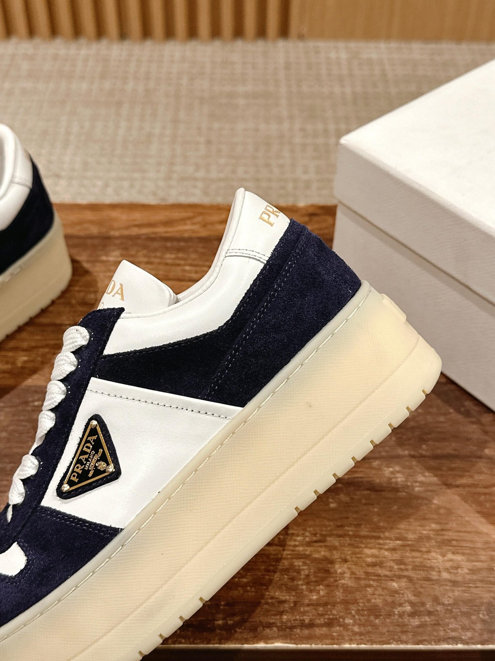 𝐏𝐑𝐀𝐃𝐀 𝟮𝟬𝟮𝟱/ 𝐬𝐬# Spring and summer new △ triangle label thick bottom white shoes casual shoes nn Suede and glossy leather splicing collision color, the sense of detail with a good sense of Triangle label embellishment, simple and advanced! The key on the foot is super leg-length, easy to lengthen the legs to show legs! nnSize 35-39 (40/41 customized non-returnable) $158.00