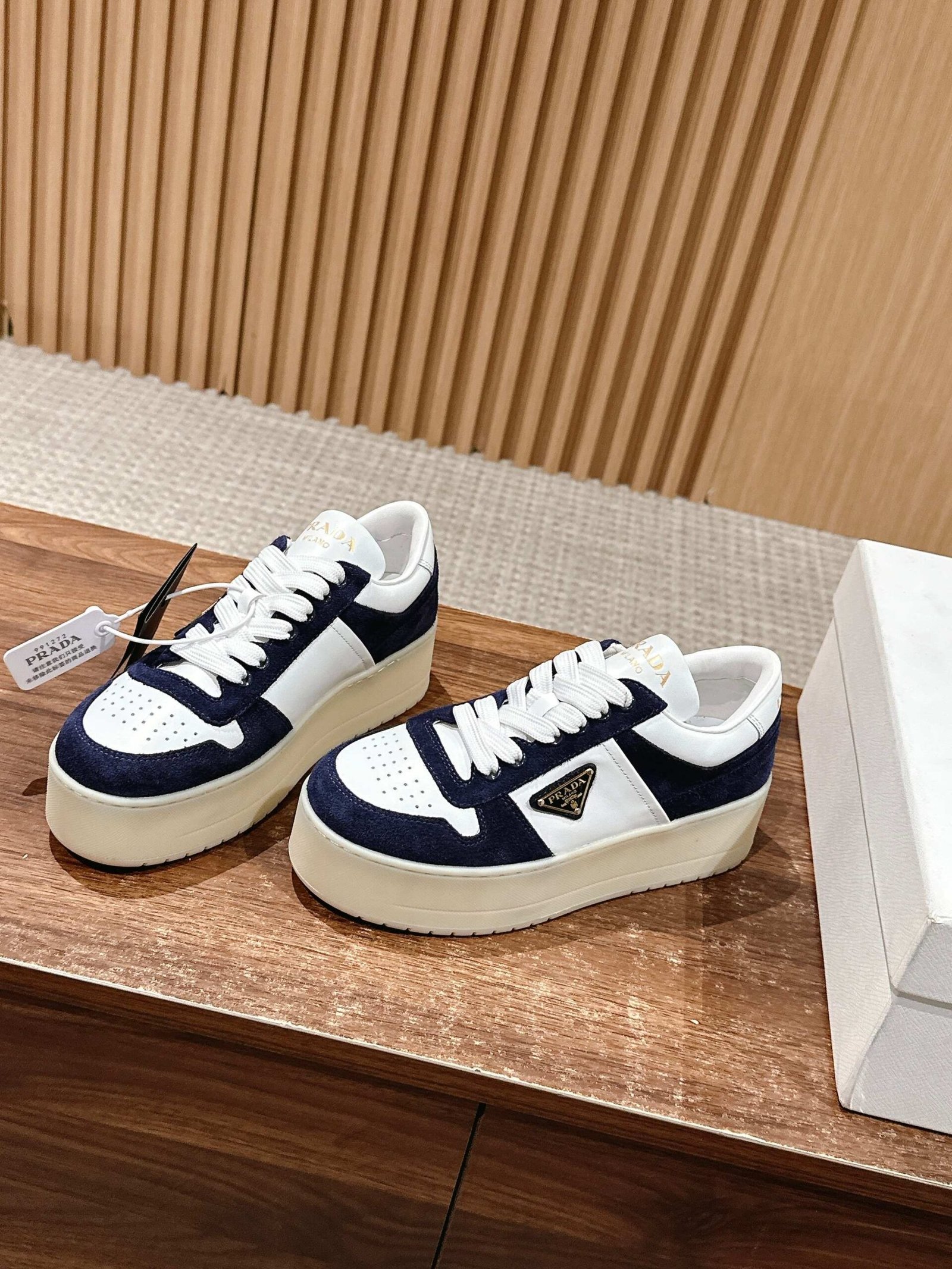 普拉达 春夏新款三角标厚底小白鞋休闲鞋nn麂皮和光面皮拼接撞色细节感跟好 三角标点缀简单高级关键上脚超显腿长轻松拉长腿部显腿nnSize 定做不退换