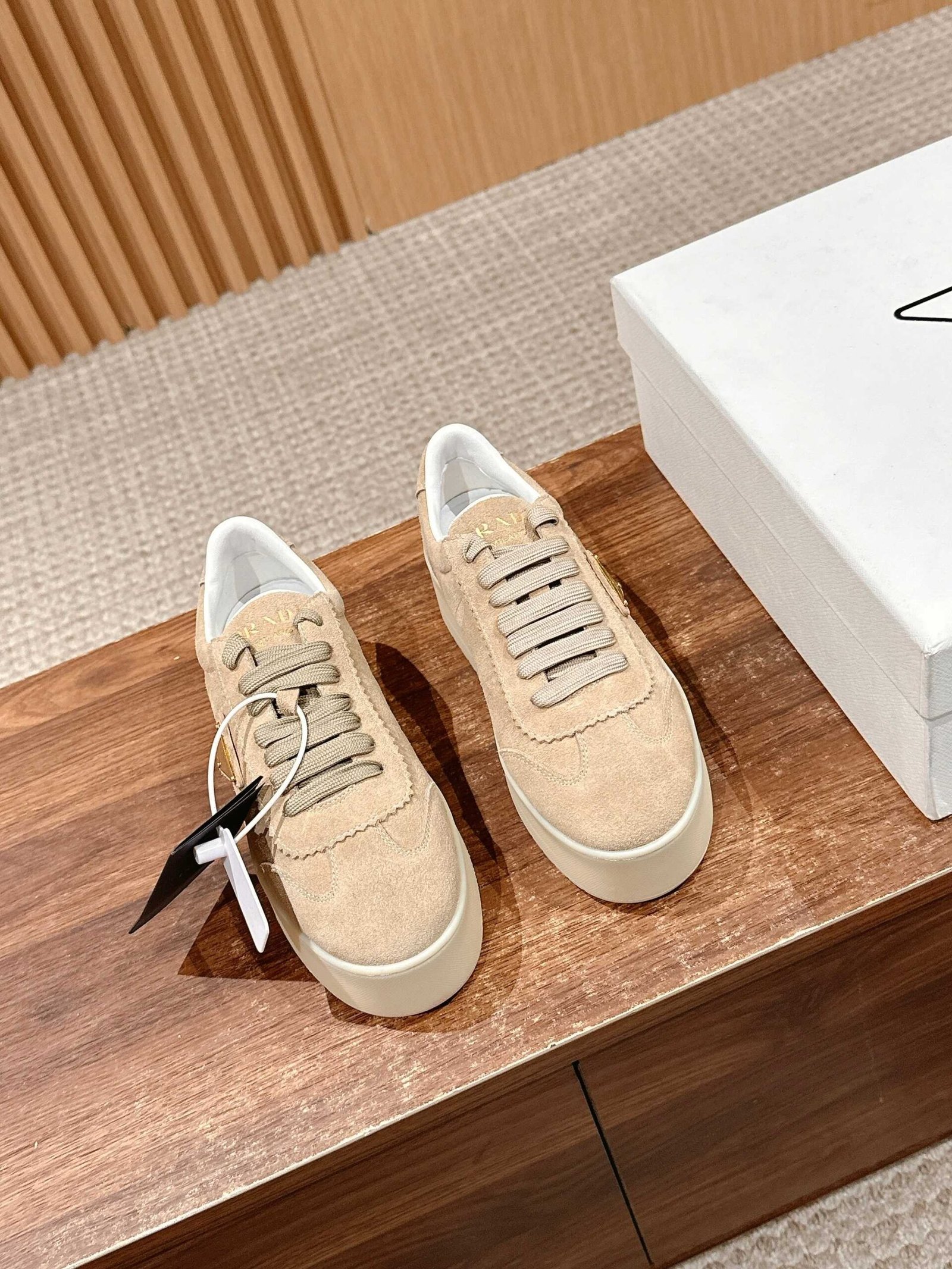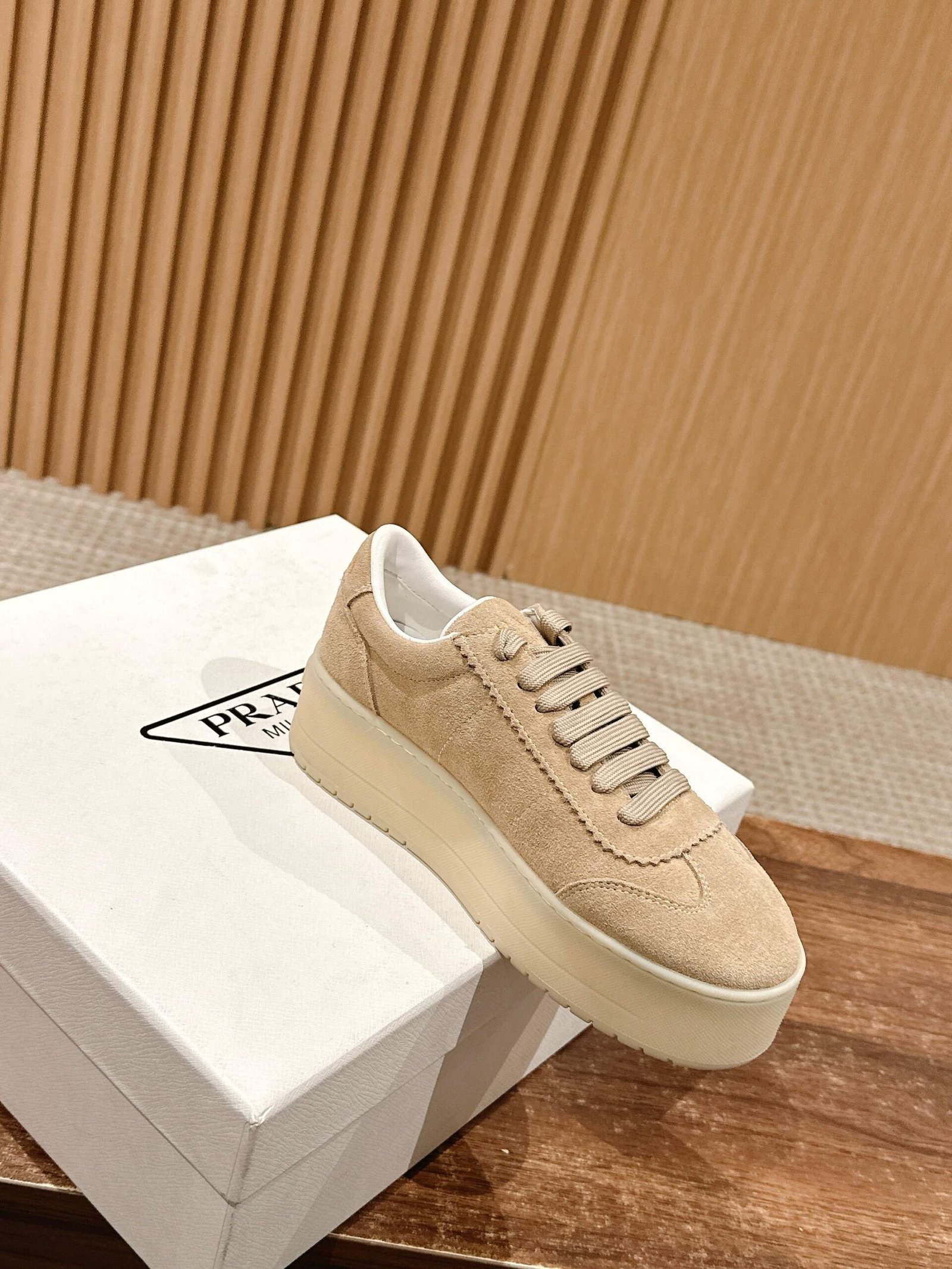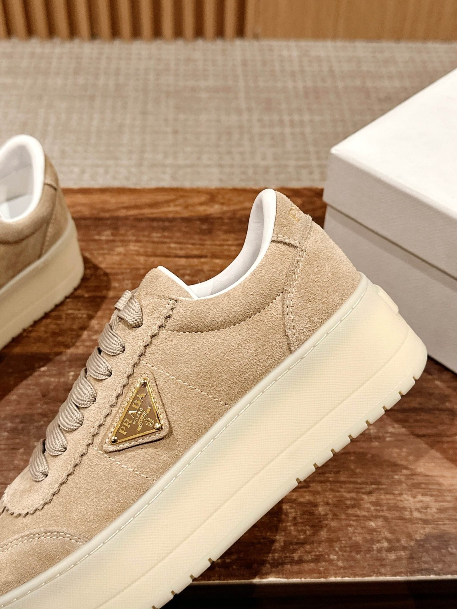 普拉达 春夏新款三角标厚底小白鞋休闲鞋nn麂皮和光面皮拼接撞色细节感跟好 三角标点缀简单高级关键上脚超显腿长轻松拉长腿部显腿nnSize 定做不退换
