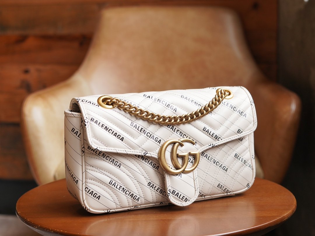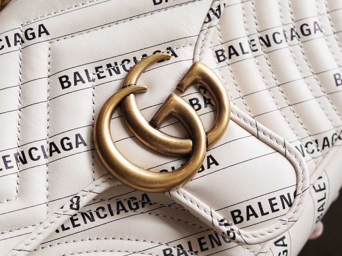 The Aria – Fashion Aria fashion collection explores the world of fashion with the launch of The Hacker Project collection! for the concept of originality and appropriation. Alejandro Micheli pays homage to heritage and classicism with the new collection, colliding iconic Balenciaga silhouettes with Gucci elements in a witty and harmonious new idea. As part of this special collection, this GG Marmont shoulder bag is reinterpreted in “Balenciaga” printed white leather.