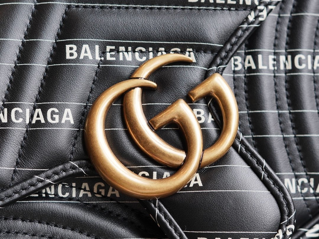 nThe Aria – Fashion Aria fashion collection explores the world of fashion with The Hacker Project series. for the concepts of originality and appropriation. With the new collection, Alejandro Micheli pays homage to heritage and classicism, using iconic Balenciaga silhouettes and Gucci elements to collide in a witty and harmonious new idea. As part of this special collection, this GG Marmont shoulder bag is reinterpreted in ‘Balenciaga’ printed black leather.