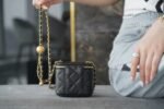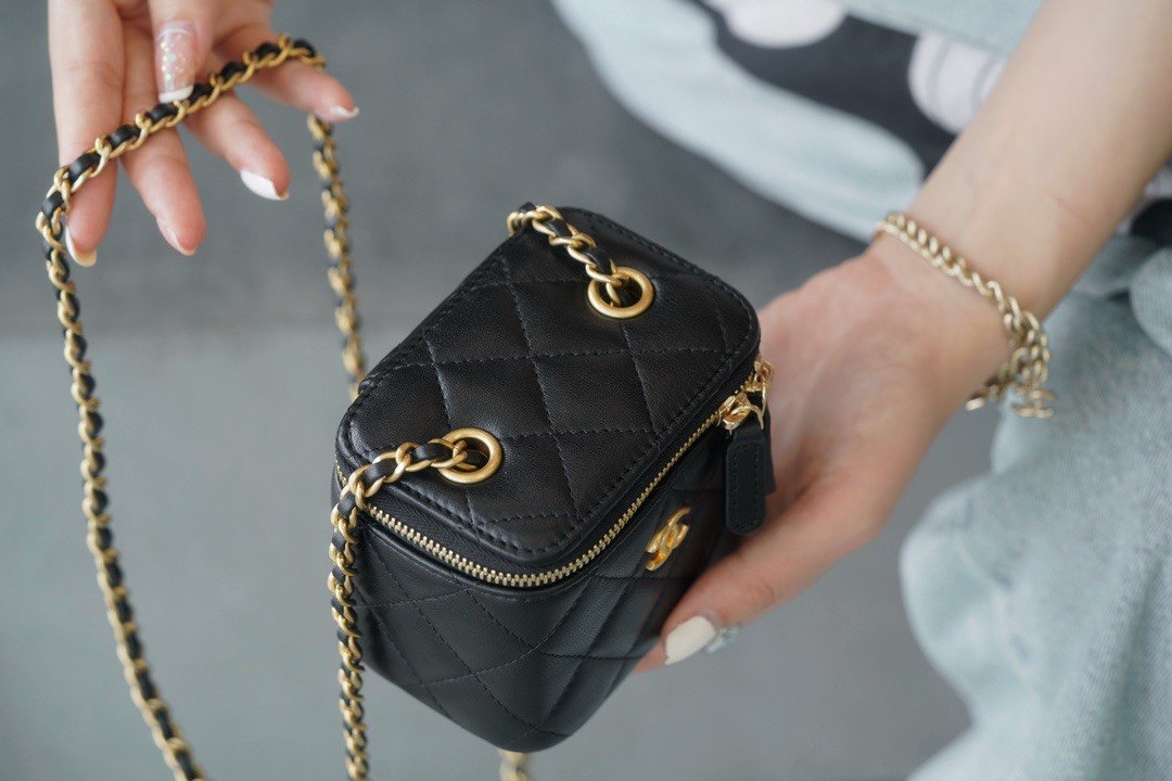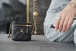 𝖢𝗁𝖺𝗇𝖾𝗅 ❥𝟚𝟘𝟚1 Haute Couture Handle Coin Purse Black nnClassic diamond check pattern and mouth flap design, the metal is vintage old sand gold, in line with this season's 'Renaissance' theme ✿, round leather handle, line design is excellent ✓ can be shoulder slanting, crossbody handheld, a small one, simply adorable to explode 🍥nnSize: 9.5 x12.5×3.5cmn 🔍: B21100570 $98.00