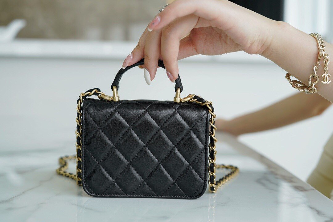 𝖢𝗁𝖺𝗇𝖾𝗅 ❥𝟚𝟘𝟚1 Haute Couture Handle Coin Purse Black nnClassic diamond check pattern and mouth flap design, the metal is vintage old sand gold, in line with this season’s ‘Renaissance’ theme ✿, round leather handle, line design is excellent ✓ can be shoulder slanting, crossbody handheld, a small one, simply adorable to explode 🍥nnSize: 9.5 x12.5×3.5cmn 🔍: B21100570
