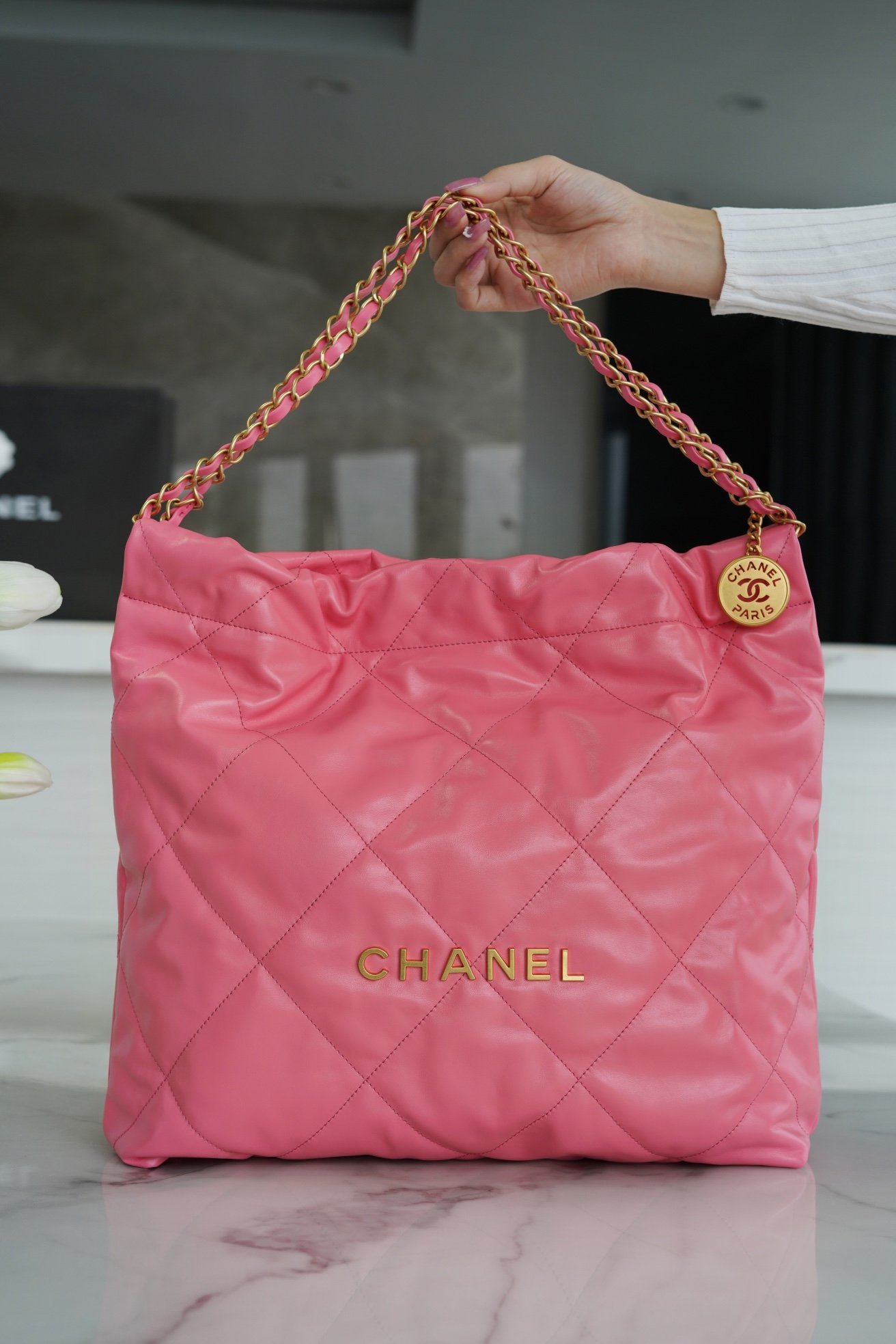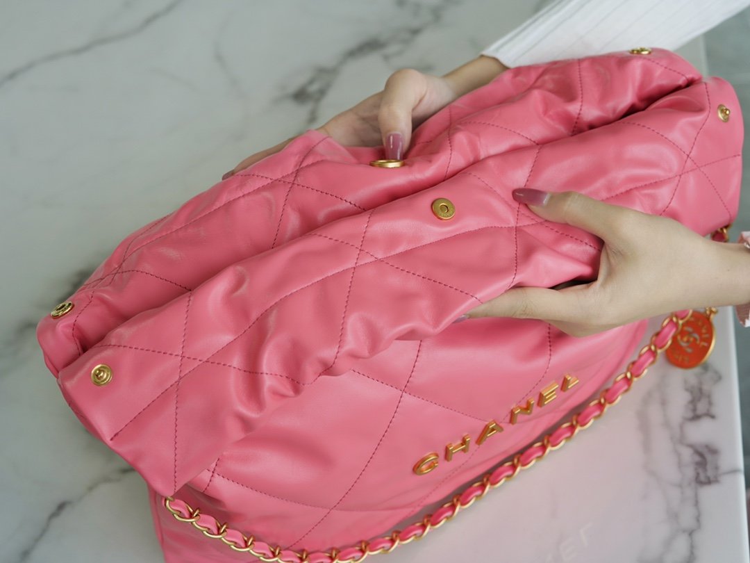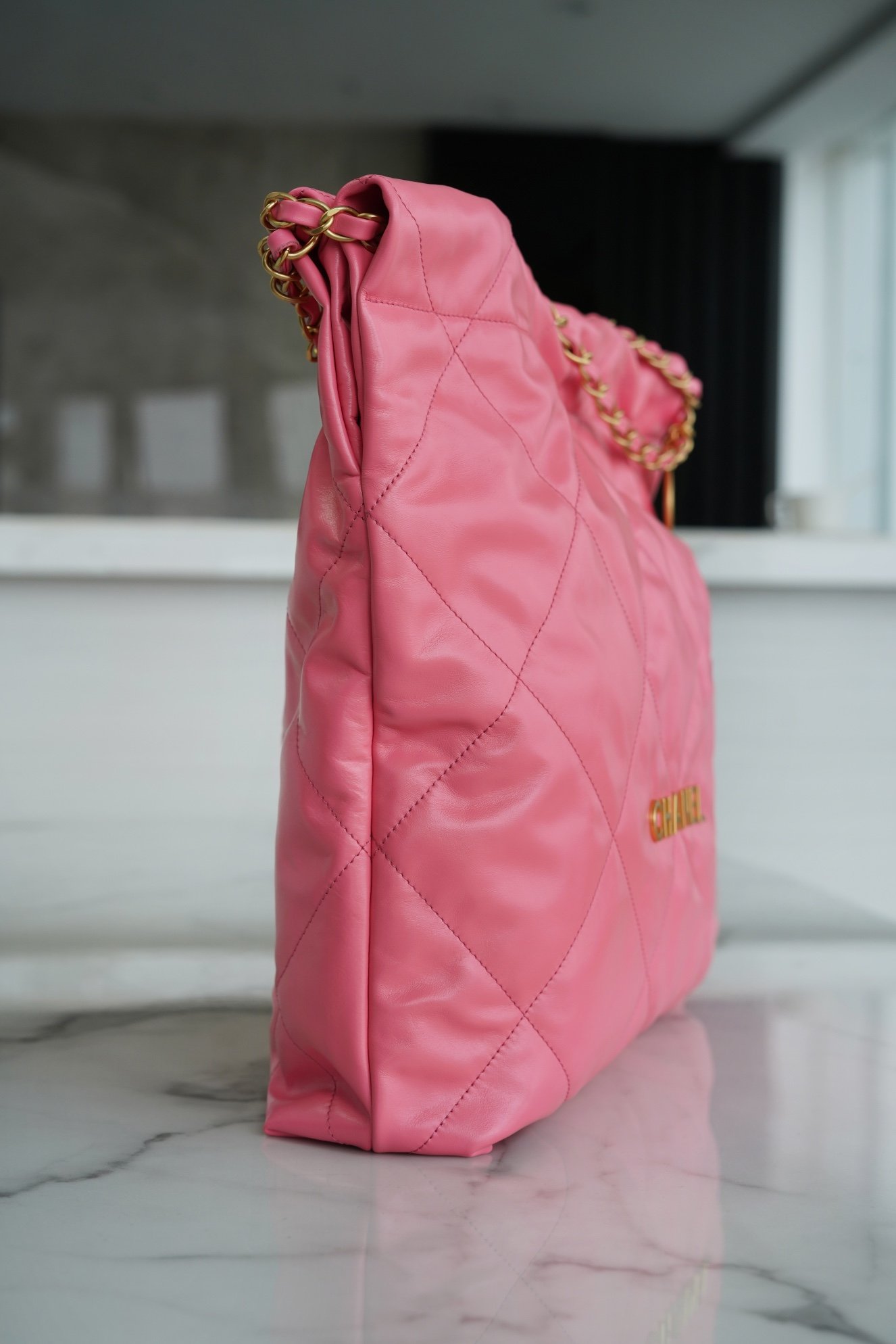 ๐—–๐—›๐—”๐—ก๐—˜๐—Ÿ ๐Ÿ๐Ÿ๐—ฃSpring/Summer New! ๐Ÿ๐Ÿ Handbags Medium Coral Pink ๐Ÿ’•nn Glossy Cowhide Leather Smooth on the Hand With Clear Leather Folds Texture n Aged Metal, Three-dimensional Logo, Classic Black and Gold Color Scheme! nThe top drawstring double chain design with double C Logo connected to the lower half of the single chain, the bottom of the left and right each a small ear with Logo “rivets” to fix the end of the single chain, the inside has a zipper compartment a key chain convenient to hang the keys and other small objects … will be simple and comfortable as one, for you to pack the whole spring ๐Ÿƒ! nnSize: 39*42*8cmn ๐Ÿ”: 22610561