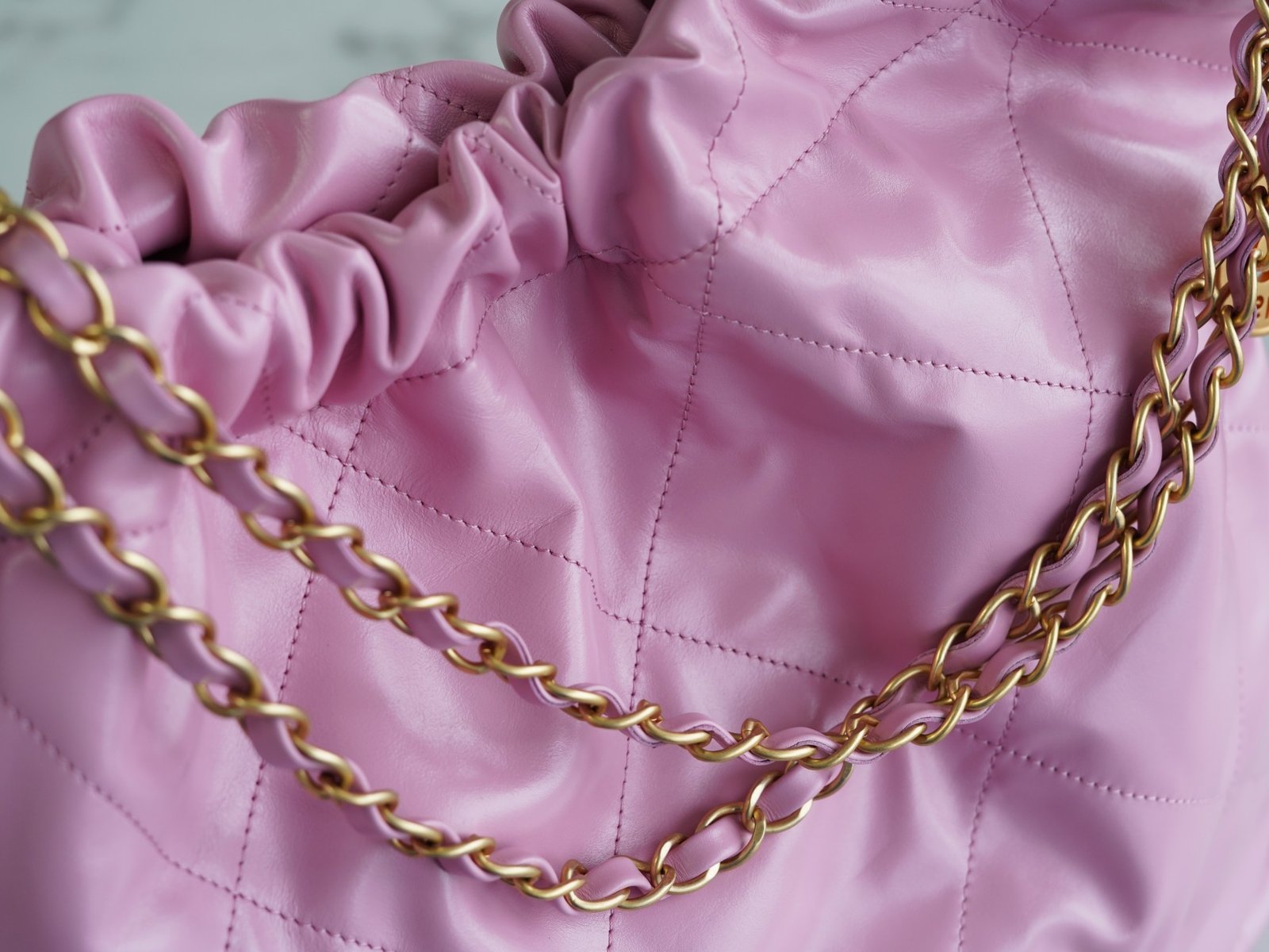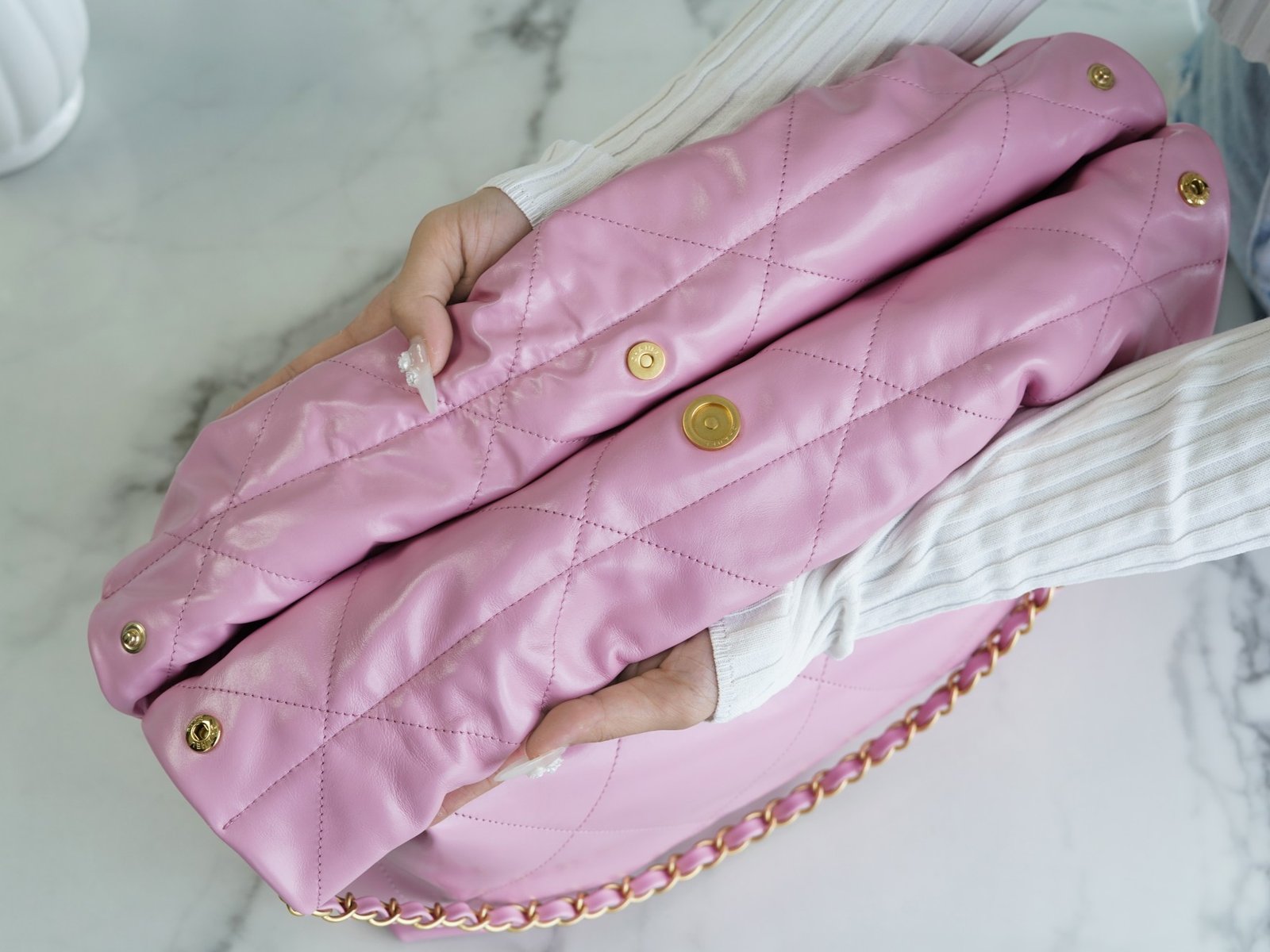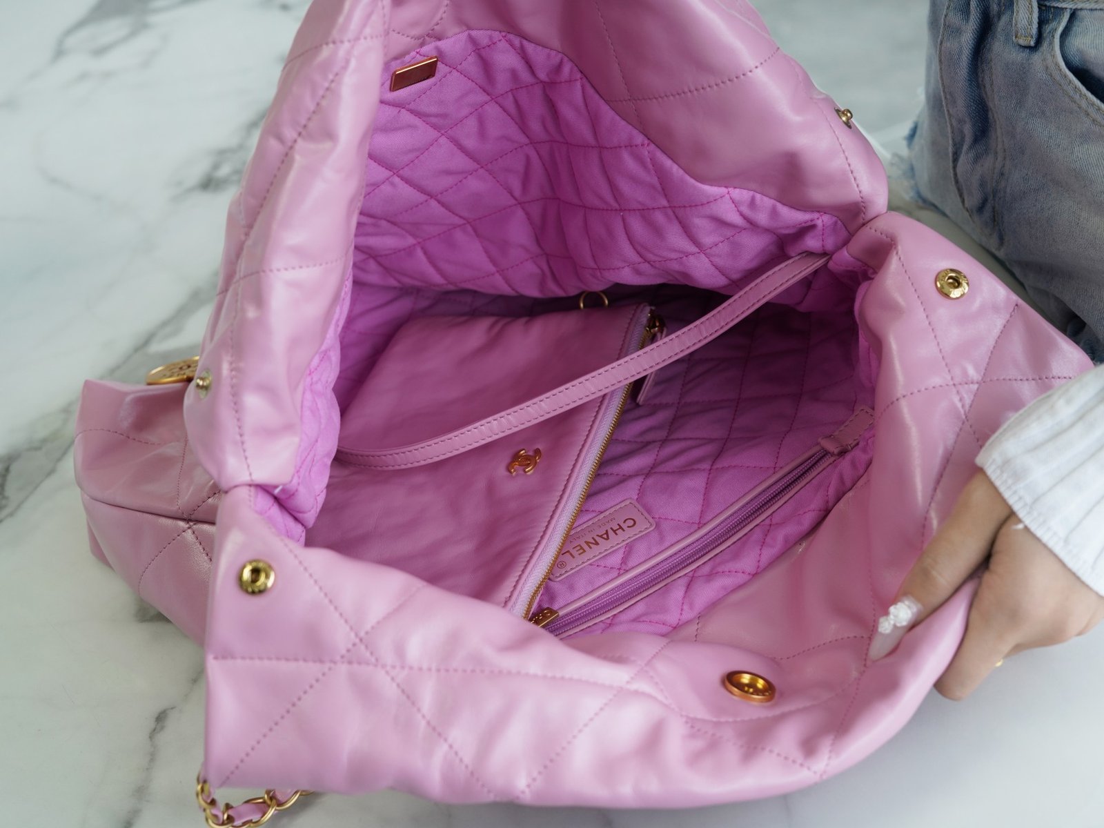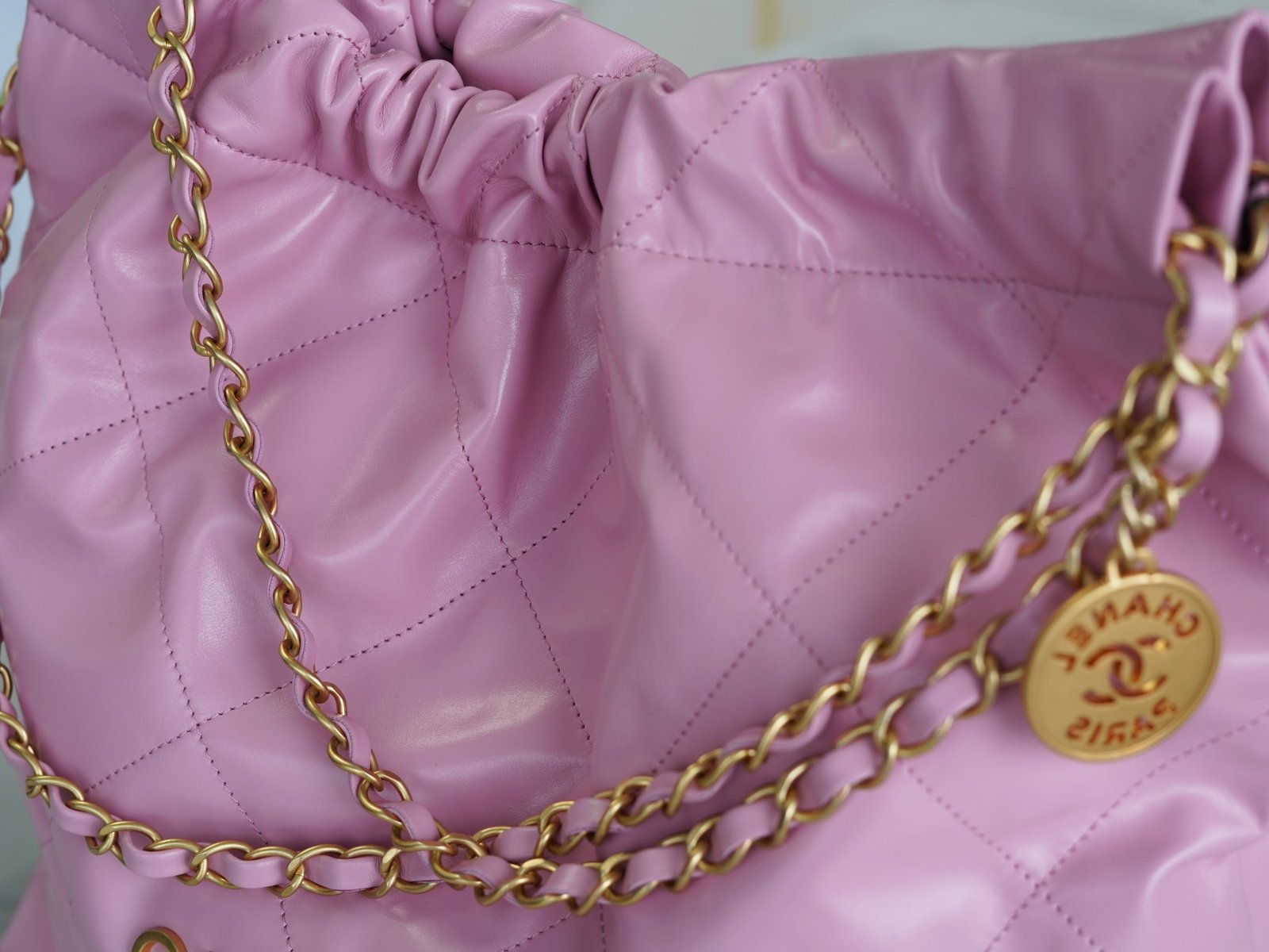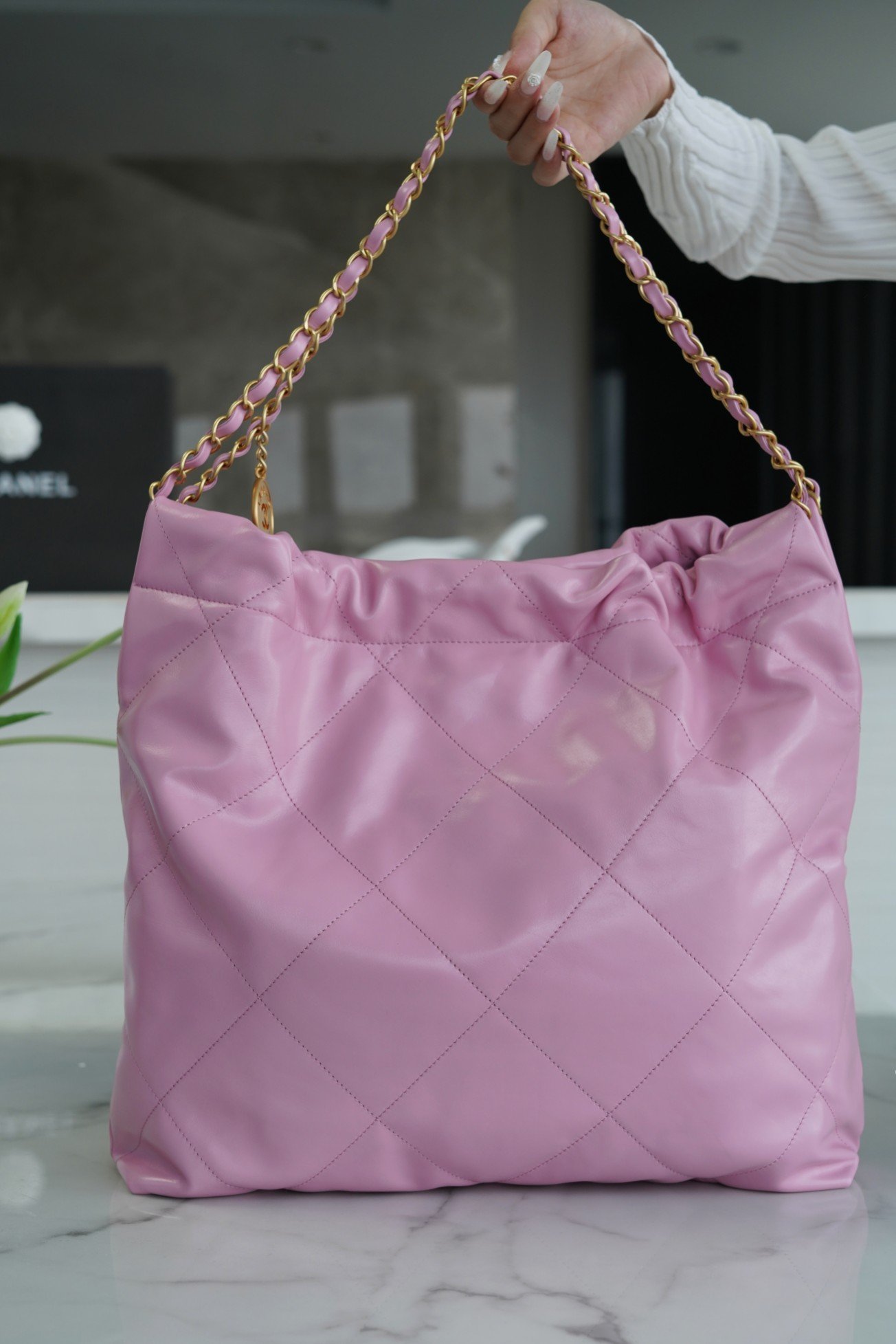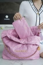 ๐—–๐—›๐—”๐—ก๐—˜๐—Ÿ ๐Ÿ๐Ÿ๐—ฃSpring/Summer New! ๐Ÿ๐Ÿ Handbags Medium Pink Purple ๐Ÿ’•nn Shiny cowhide leather is smooth on the hand with clear leather folds texture n Aged metal, three-dimensional Logo, classic black and gold color scheme! nThe top drawstring double chain design with double C Logo connected to the lower half of the single chain, the bottom of the left and right each a small ear with Logo “rivets” to fix the end of the single chain, the inside has a zipper compartment a key chain convenient to hang keys and other small objects … will be simple and comfortable as one, for you to pack the whole spring ๐Ÿƒ! nnSize: 39*42*8cmn ๐Ÿ”: 22610561