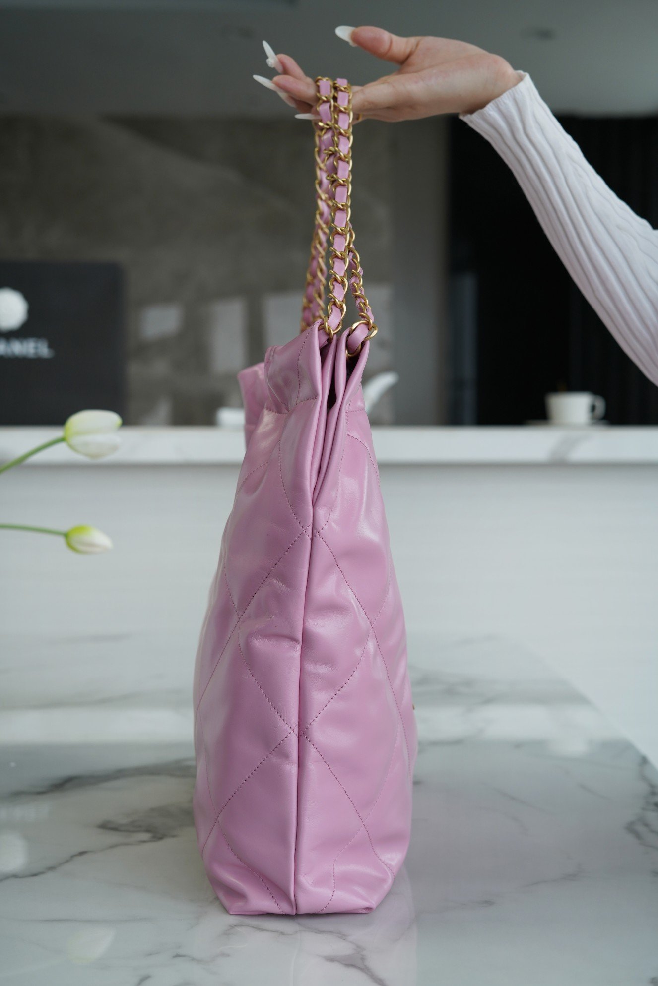 The top drawstring double chain design with double C Logo connected to the lower half of the single chain, the bottom of the left and right each a small ear with Logo “rivets” to fix the end of the single chain, the inside has a zipper compartment a key chain convenient to hang keys and other small objects … will be simple and comfortable as one, for you to pack the whole spring ๐Ÿƒ!