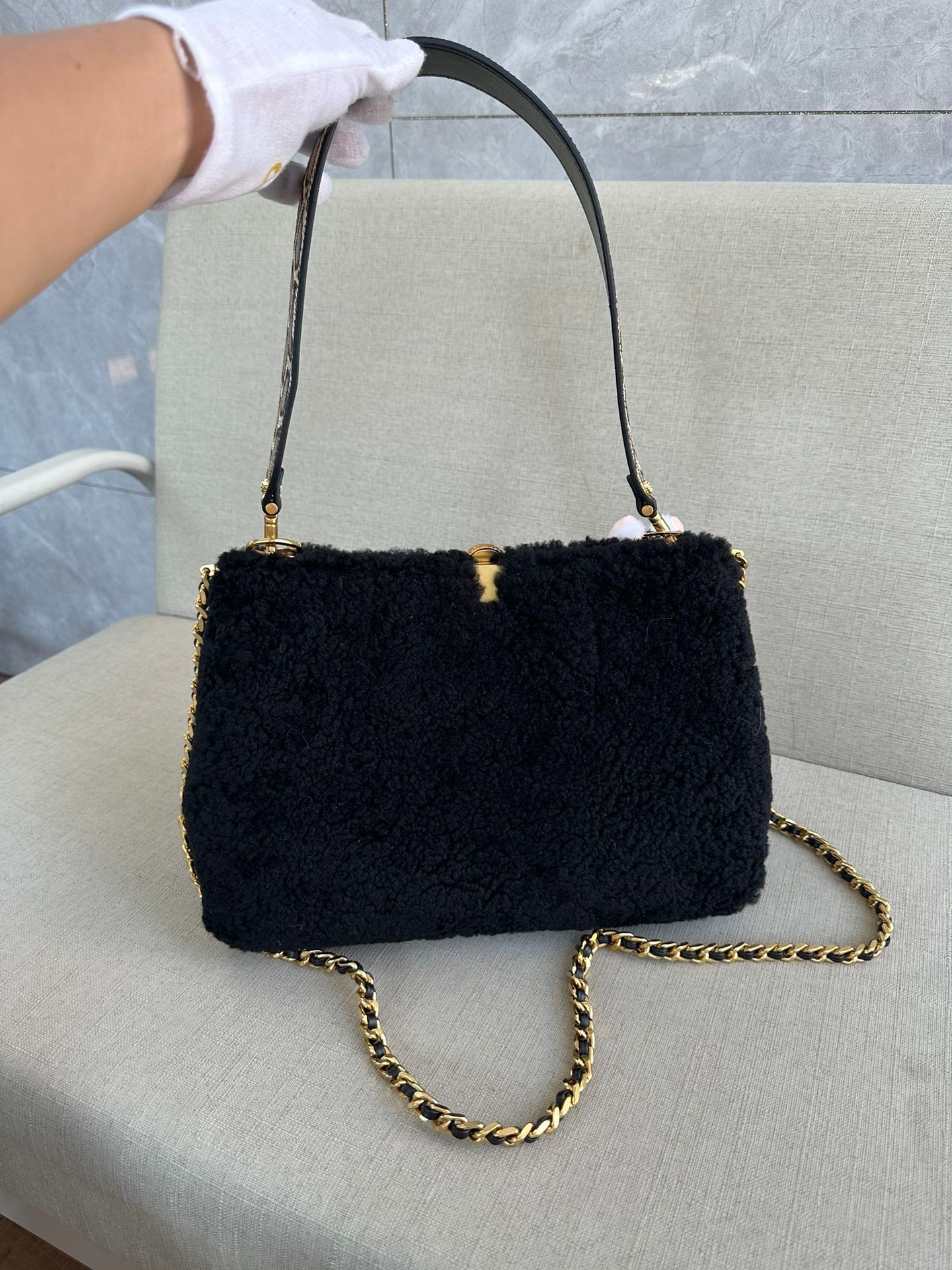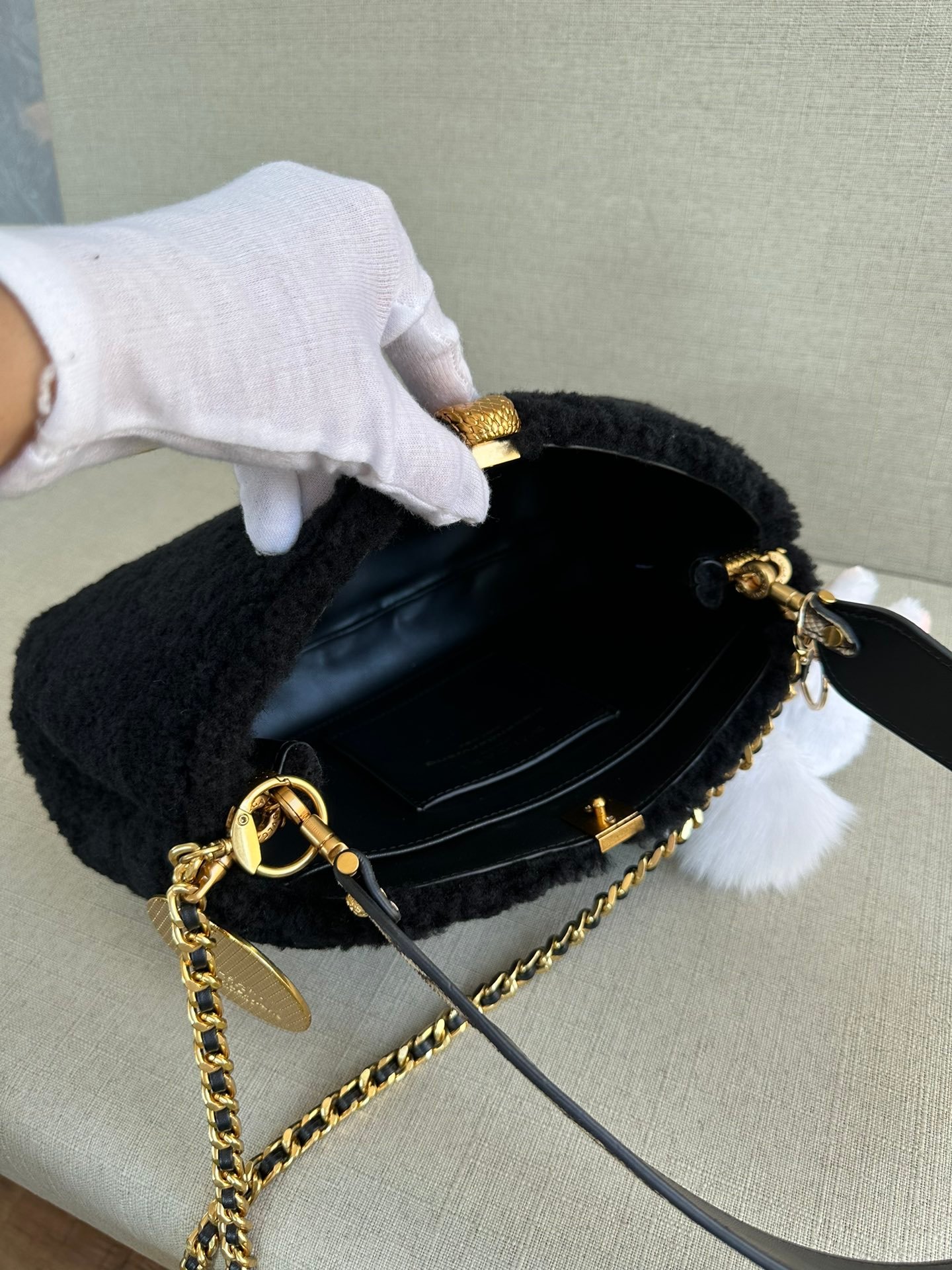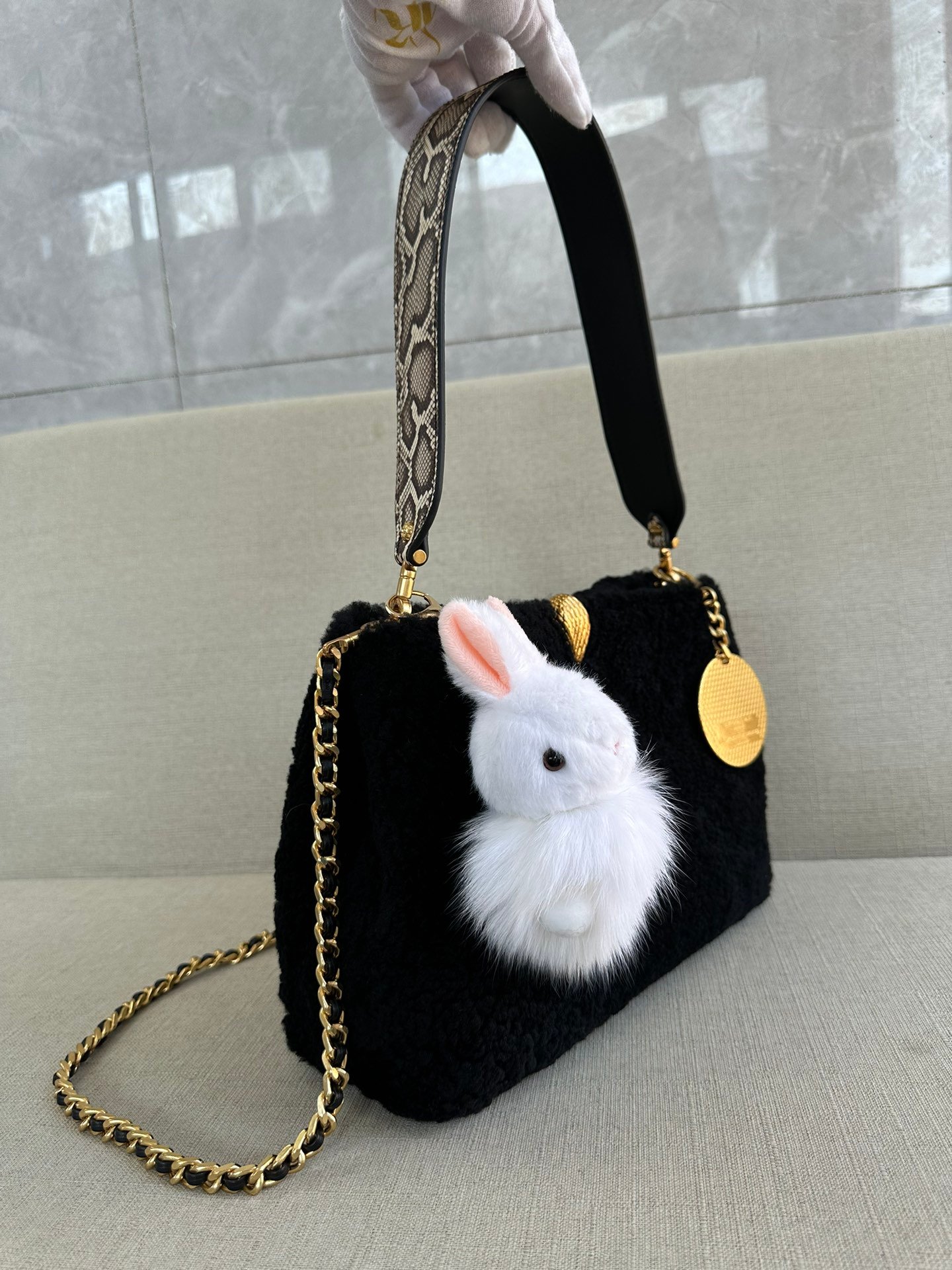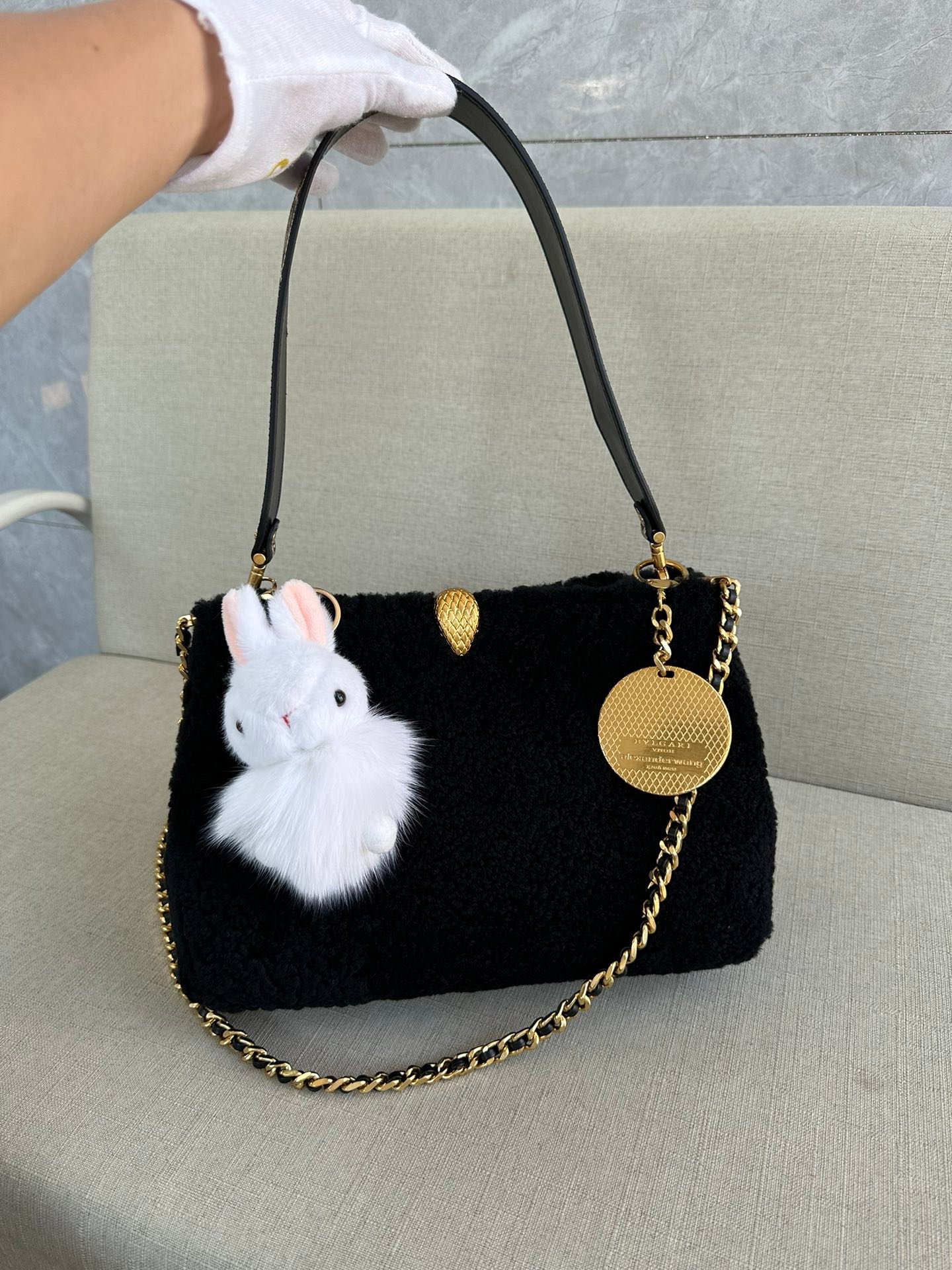 🐭alexanderwang Alexander. King and Bulgari’s collaboration model! 100% authentic! ⚠️100% fully imported cashmere! All full leather inside, handbag crossbody bag shoulder bag ! Iconic snake head logo! Comes with a movable leather handle and another movable long chain! ⚠️ with a beautiful rabbit 🐰 pendant and bronze mirror pendant! Can be handheld Shoulder Can be crossbody, stitch by stitch craftsmanship allows you to distinguish between small workshop F goods! Quality details are perfect! Size: L30*H20*W10