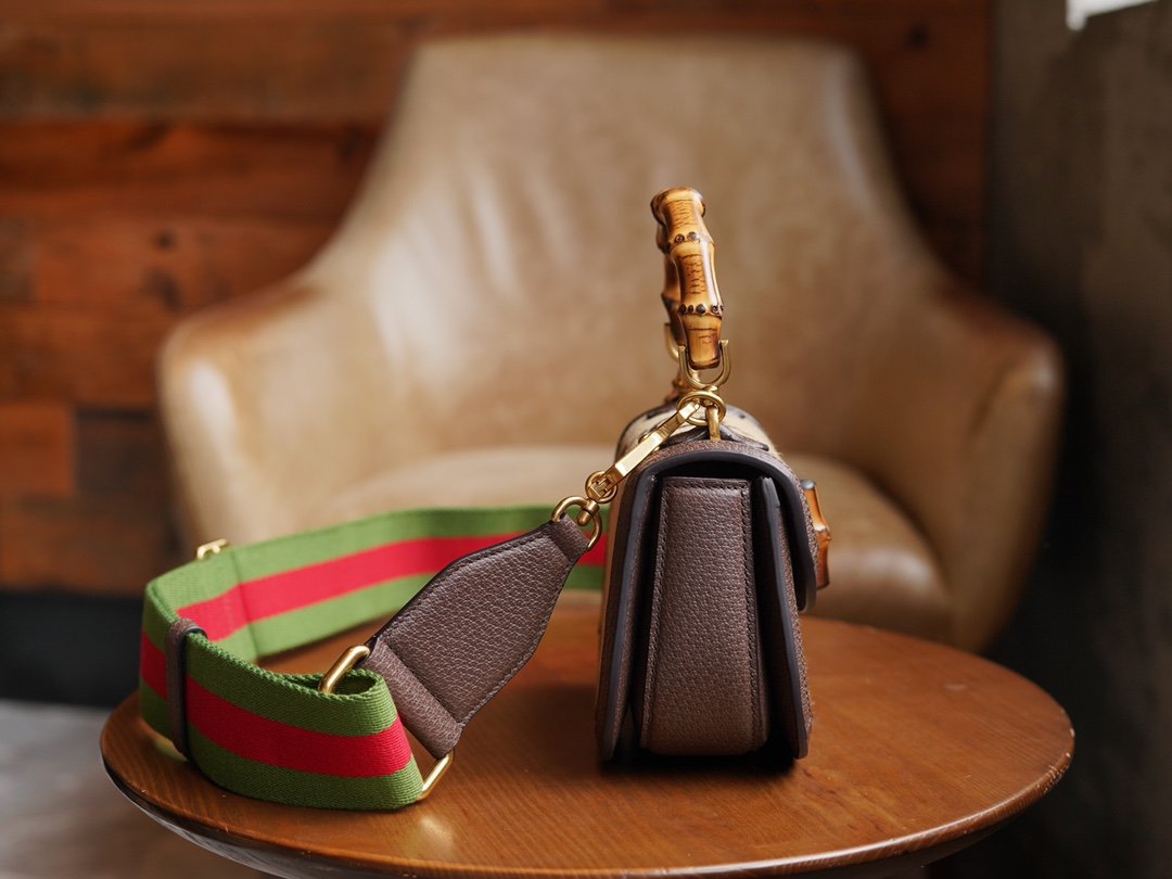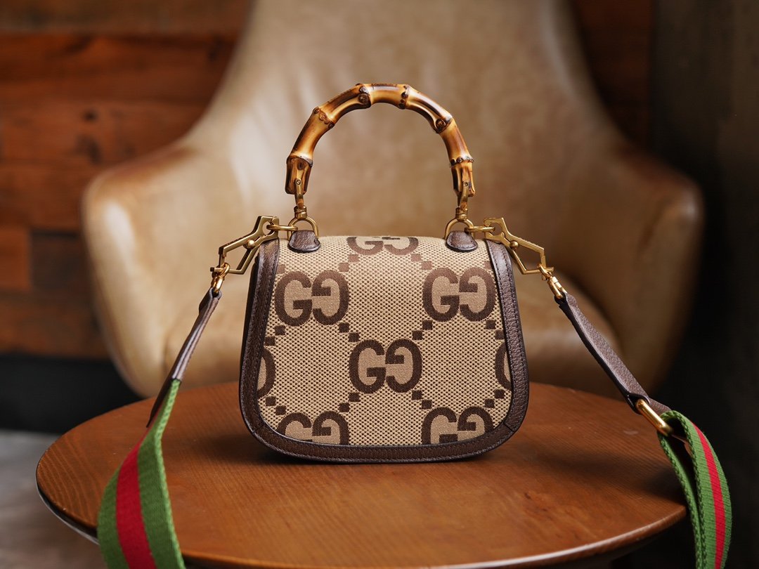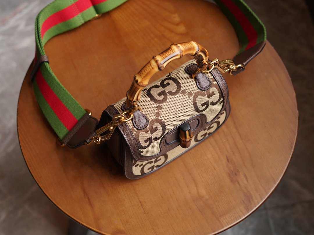 Bamboo Handbag Mini Canvas nnThe brand’s symbols are reinterpreted in different ways every season. The “Aria” collection features a new design with double G’s in an eye-catching style. This small handbag is designed with bamboo handles, giving a modern twist to the classic material. nSize: 17*12*7.5cmnModel No.: 686864