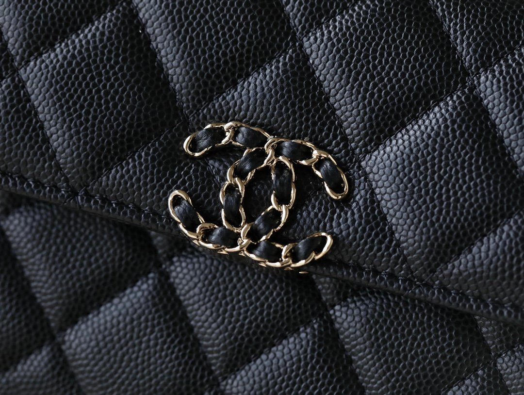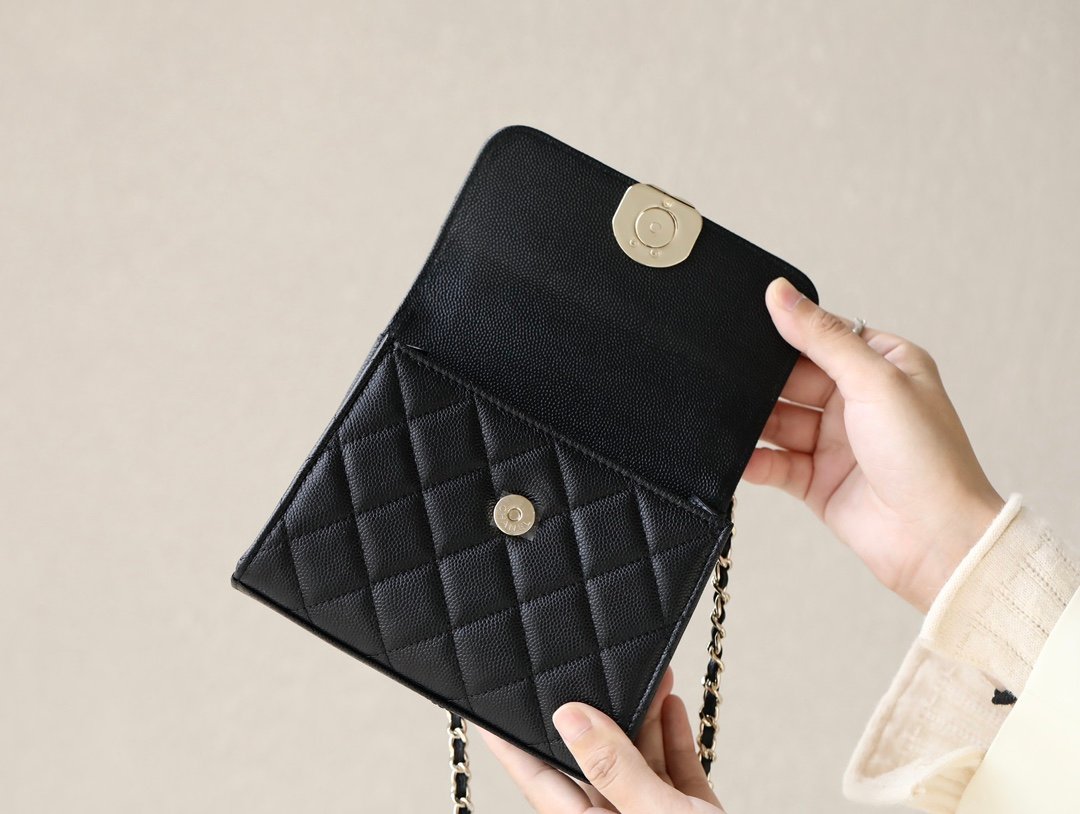 chanel 2024A messenger bag n small black oil waxed leather n gold double logo embellishment n will be a clever combination of luxury and beauty n with black and gold woven thin chain and small handle n not only highlights the sense of gold but also enhance the overall atmosphere n size: 24 * 16.5 * 6.5cm