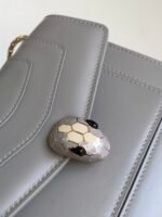Chip Edition❣️n🤍BVLGA**✨SERPENTIFOREVER COLLECTIONn🔸The bag is crafted in misty opal gray Italian calfskin n🔹with light gold all-brass hardware noff-white enamel embellished with black onyx stone sensual eyes 👀nThe classic snake head clasp is embellished with a seductive glamour n🔸Featuring a single compartment ➡️Front open pocket ➡️Back patch pocket and interior open pocket and 3 ⃣️ card slots n🔹Featuring a snake chain with a leather strap and a personalized vanity mirror with BULGARI on the reverse side Bvlgari metal n🔸 retains the practical size and classic elements n more compact and exquisite capacity n multiple carrying methods to meet the daily needs 🙌n🔹 with upgraded VIP gift box 🎁nSize:20*14*4.5Cm⚠️ 2914490501n