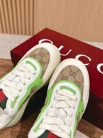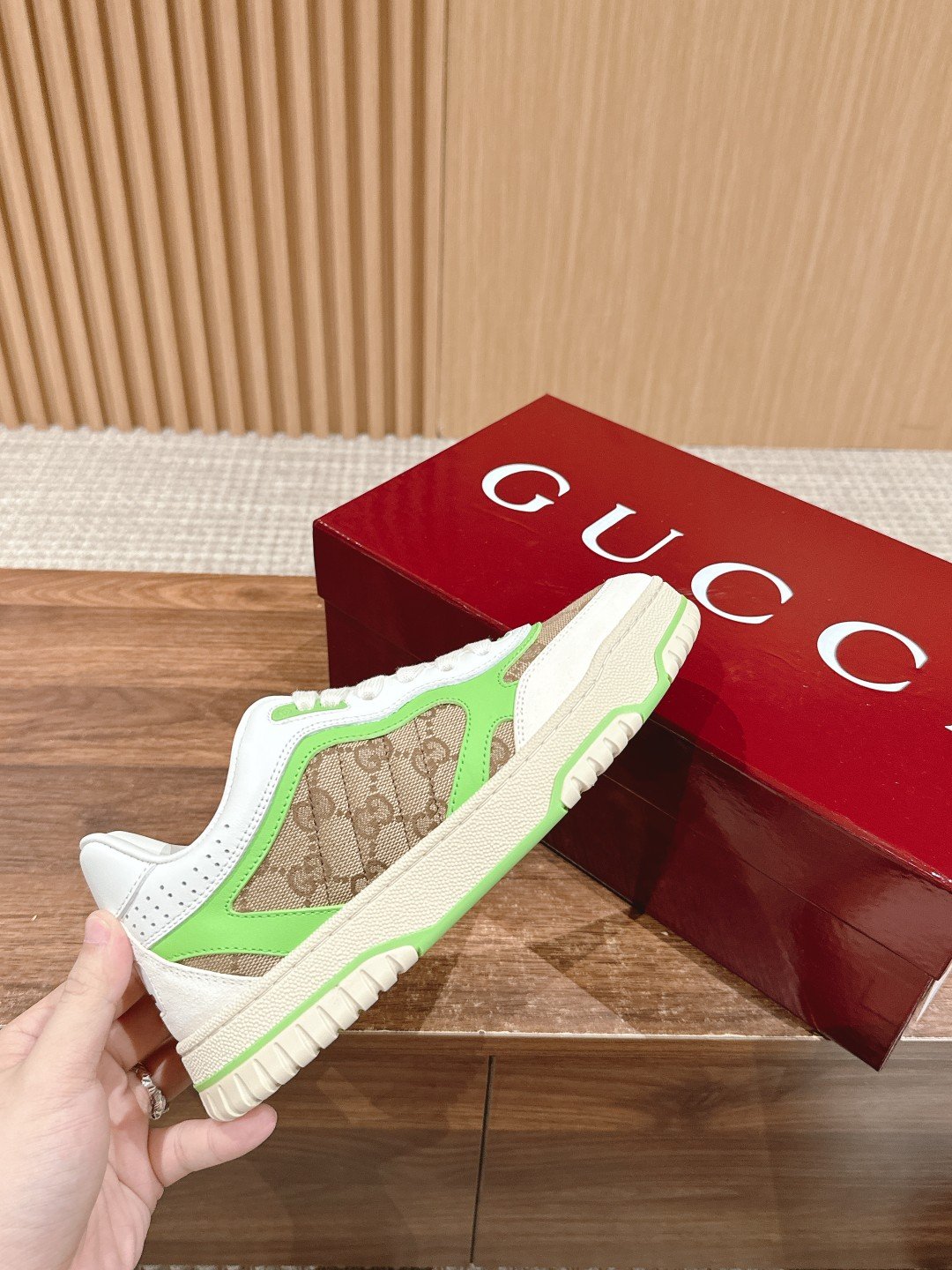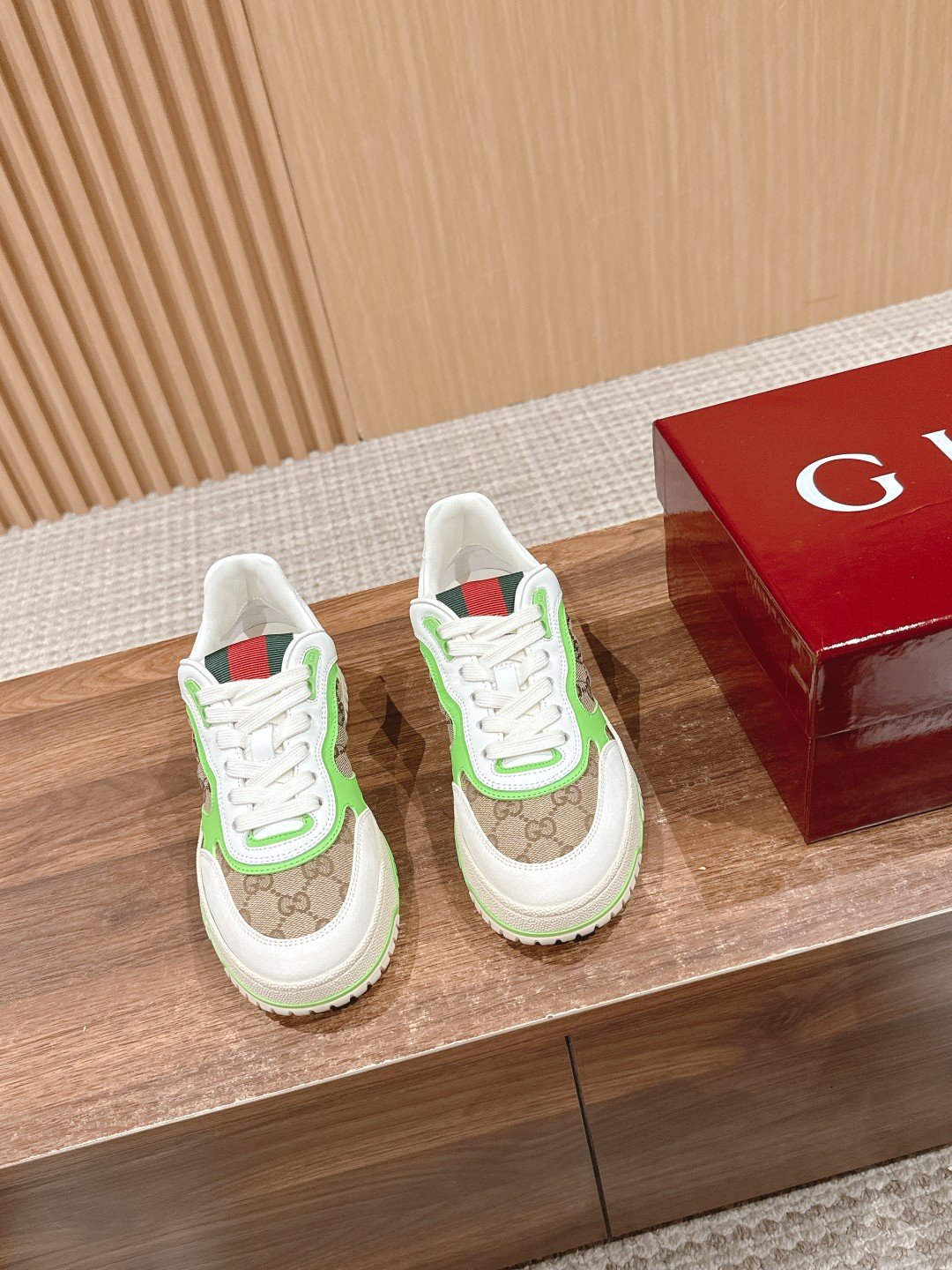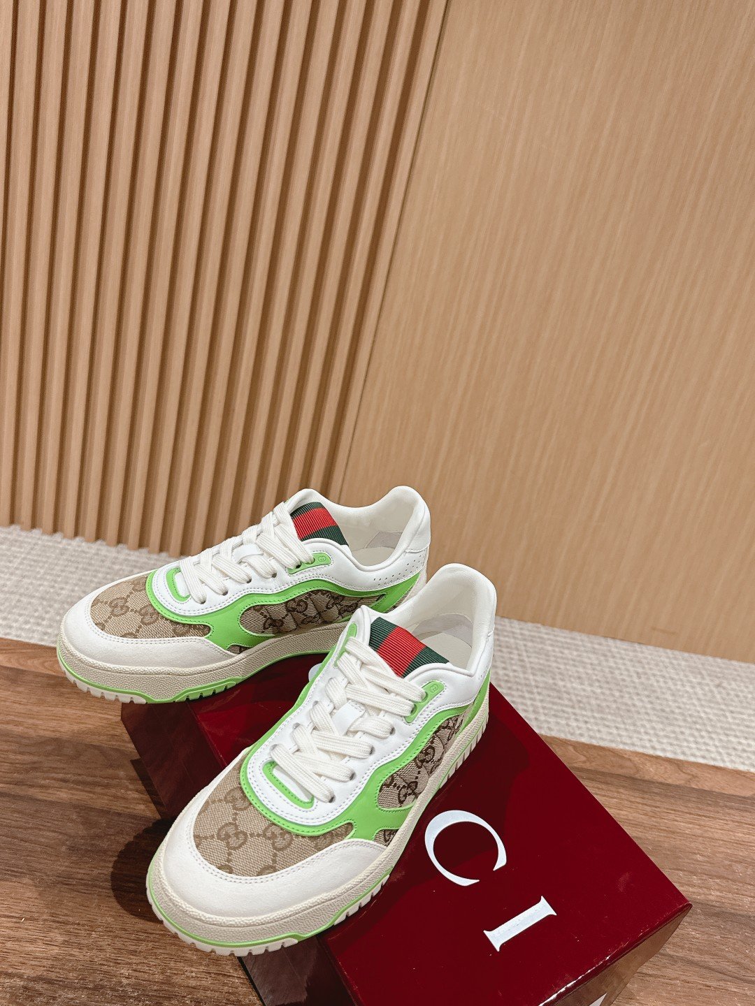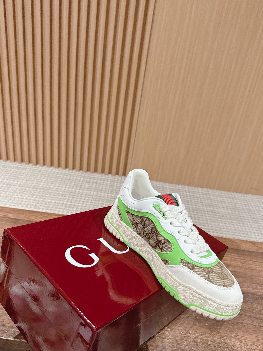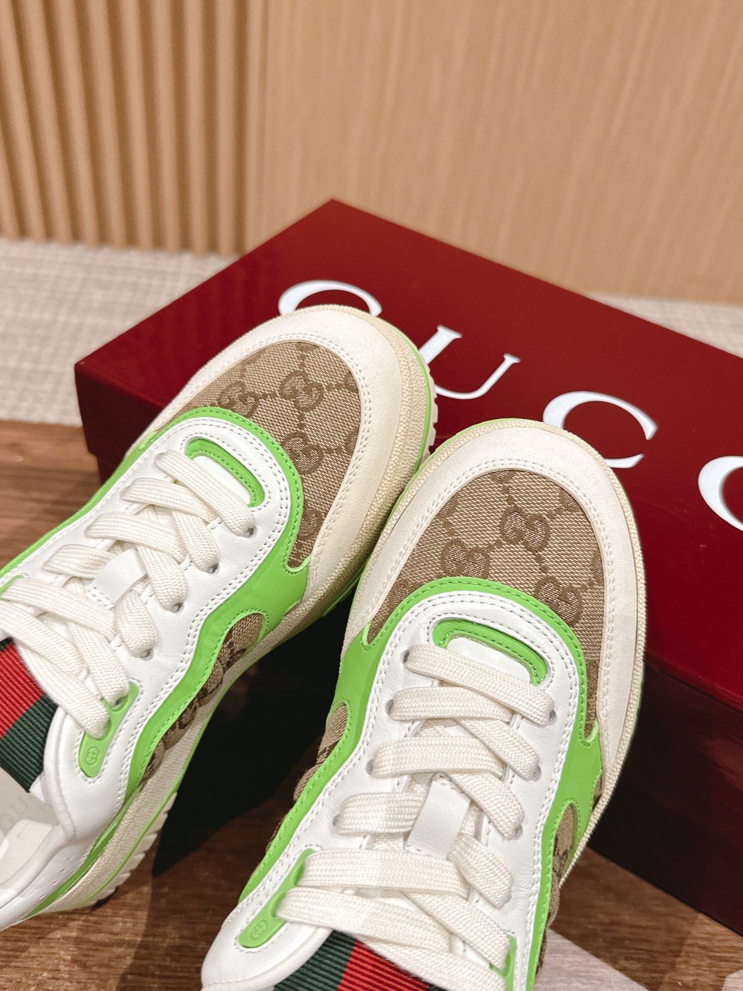 #Couple Size [Fluorescent Green Old Fashioned] 𝐆𝐮𝐜𝐜𝐢 𝐑𝐞-𝐖𝐞 𝐛 As Sabato De Sarno’s first sneaker for Gucci, the Re-Web collection reinterprets the brand’s classic stripes with bold, irreverent detailing against a modern silhouette crafted in white leather, the new sneakers are embellished with a number of the brand’s iconic details and a bright red and green lace-up tongue, making them an instant favorite. The white leather is specially treated to be soft and supple with an embossed grained texture