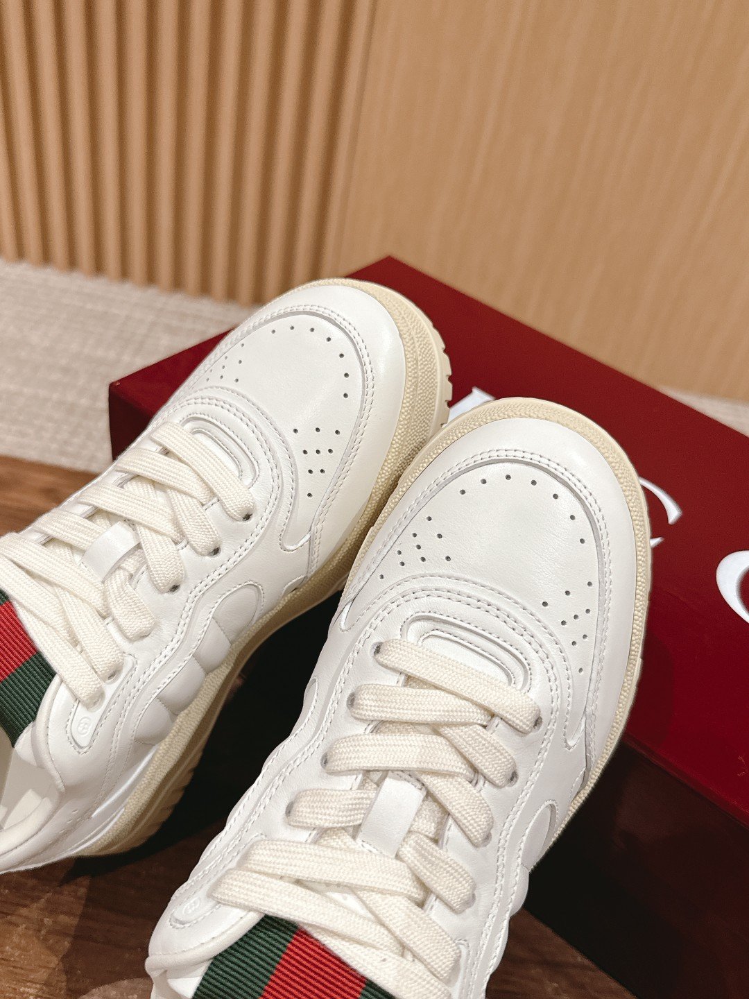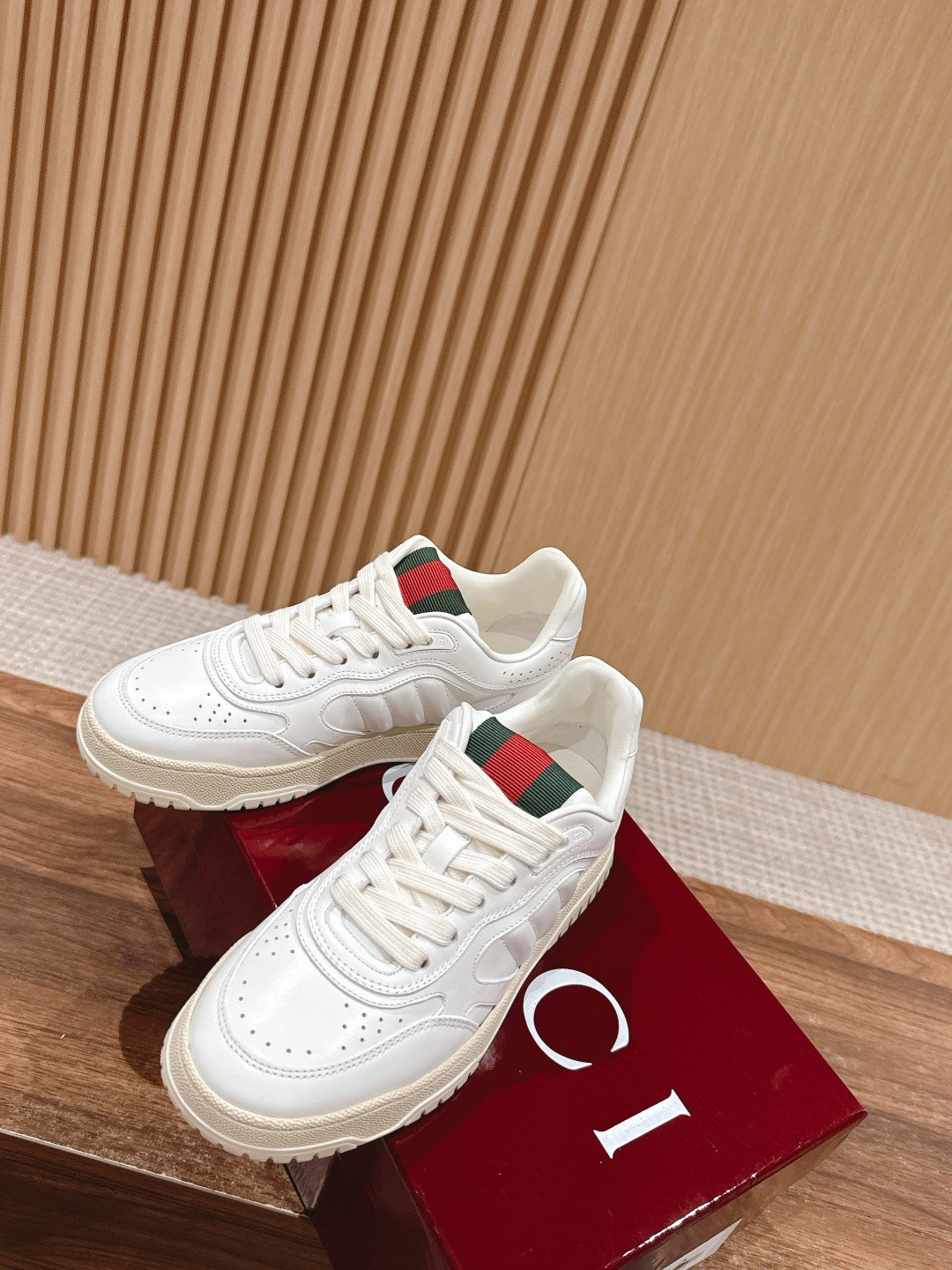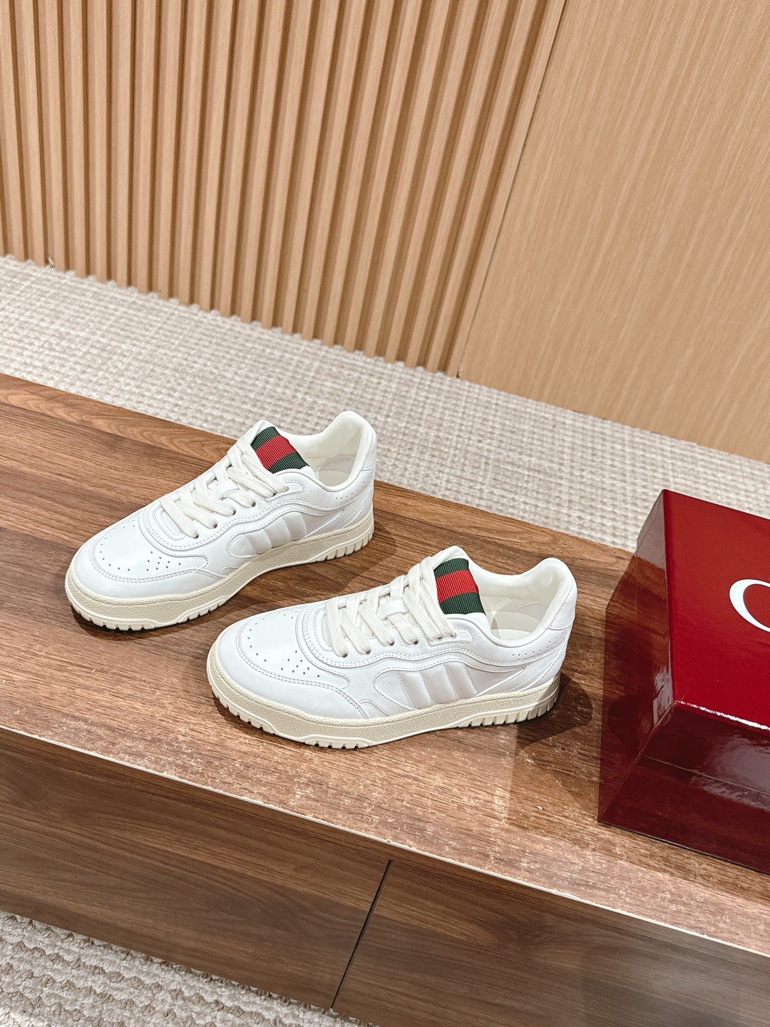 #Couple Size [Pure White] 𝐆𝐮𝐜𝐜𝐢 𝐑𝐞-𝐖𝐞 𝐛 As Sabato De Sarno’s first sneaker for Gucci, the Re-Web collection reinterprets the brand’s classic stripes with bold, irreverent detailing against a modern silhouette crafted in white leather, the new sneakers are embellished with a number of the brand’s iconic details and a bright red and green lace-up tongue, making them an instant favorite. The white leather is specially treated to be soft and supple with an embossed grained texturenn handwritten Gucci logo and interlocking double G webbing labeln with interlocking double G and handwritten Gucci logoRubber outsolen with interlocking double G detailingEyeletsn with webbing tongueSize: Women 35-40M Men 39-44M