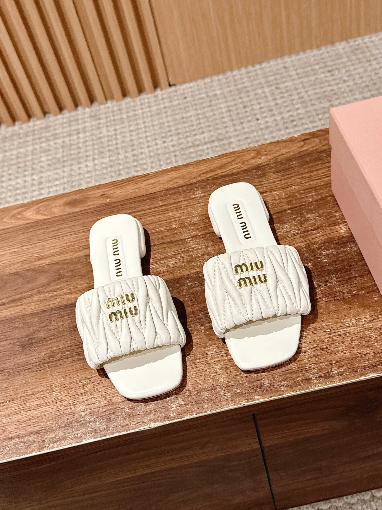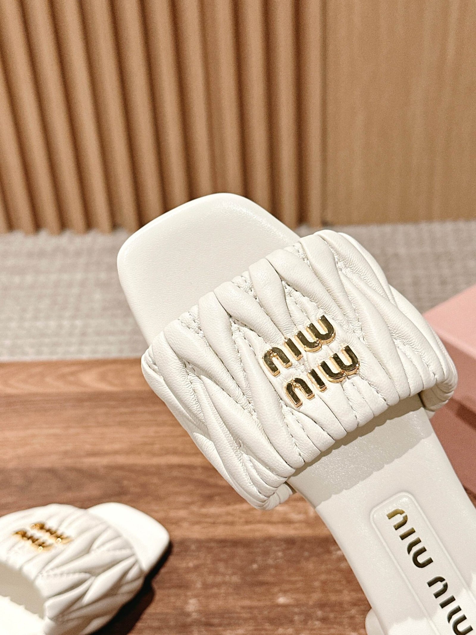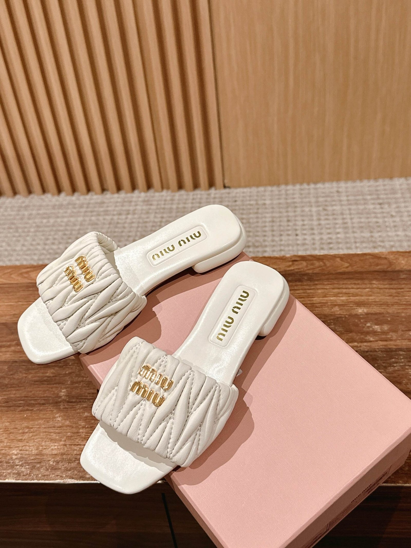 [Flat Heel] 𝐌𝐢𝐮 𝐌𝐢𝐮# Miu Miu New Pleated Cat Heel Drags n Let you walk can also be beautiful to the heart!!!! The design is very simple and atmospheric, without too much decoration and fancy design, but it comes with an elegant temperament, with a very strong ability to match, whether it is a skirt, pants or jeans, can easily match with different styles, so that you become a fashion icon!!!nnFull sheepskin made of soft and breathable leather sole nSize: 35-39 (40 customized non-returnable)