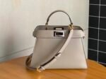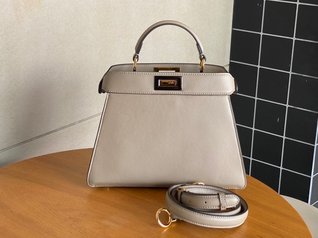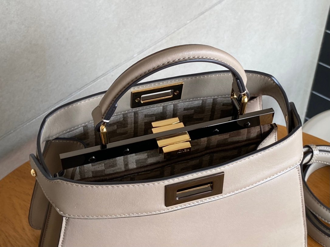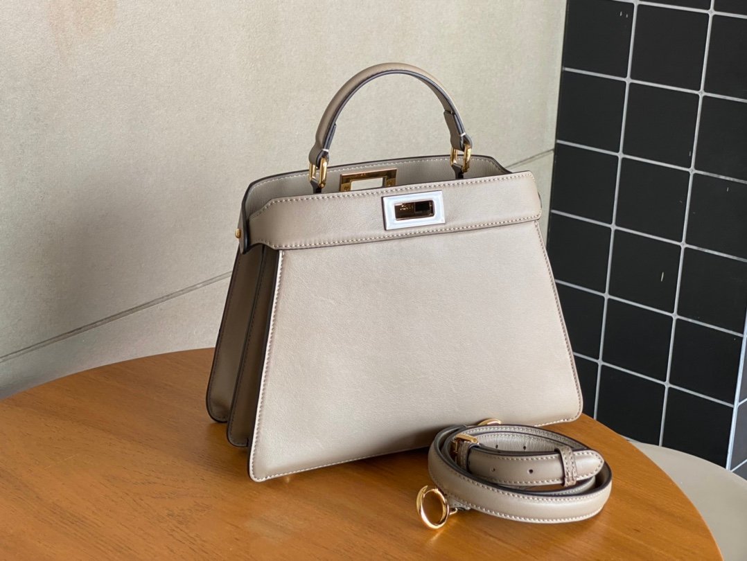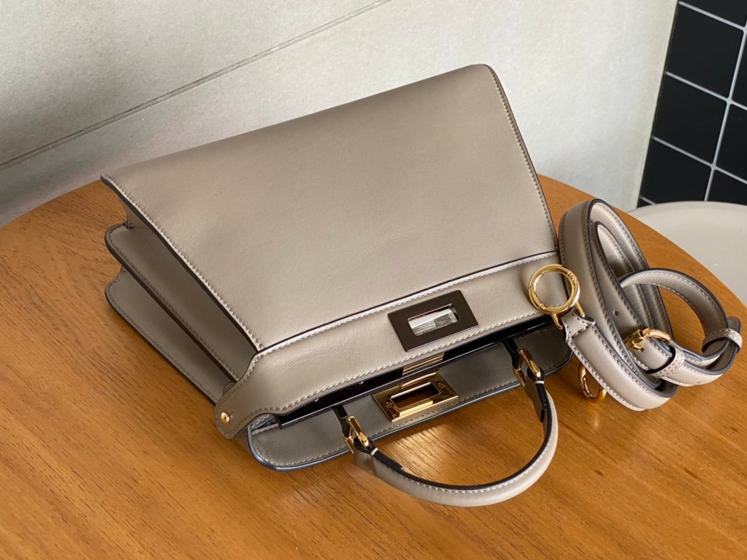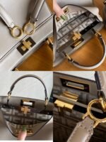FEND1PeekabooISeeU medium handbag in calfskin leather, embellished with a classic twist lock on both sides, lined in soft nappa leather, with two compartments separated by a rigid divider, featuring a tie closure internal pocket and gold-tone metal pieces. The handbag comes with handles and an adjustable, detachable shoulder strap that can be added with a tortoiseshell buckle, a sophisticated and durable bagnSize: 27*9.5*21cmnNo. 327n $118.00