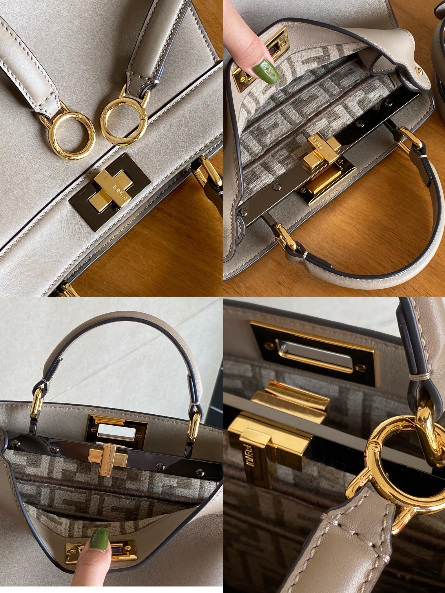 Home BAGS FENDI Grey, lined with chenille, in stocknIconic Peekaboo ISeeU small handbag in cowhide leather, decorated with a classic twist lock on both sides, two compartments separated by a rigid divider, in chenille up-to-date, with interior pockets with tortoiseshell-effect Plexiglas buttons, trims and openings, and metal pieces. The handbag has handles and an adjustable, detachable shoulder strap and can be carried by hand, over the shoulder or across the body. Size 27*21*9.5cm🐝🐝327M