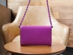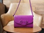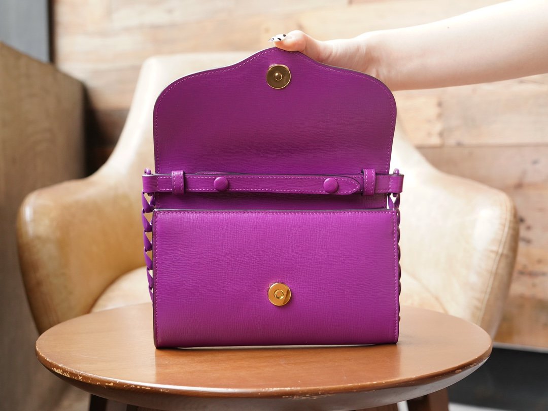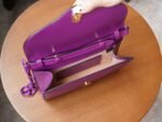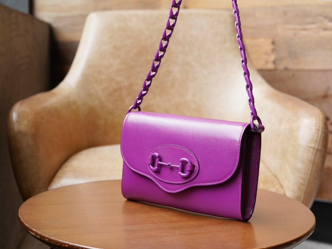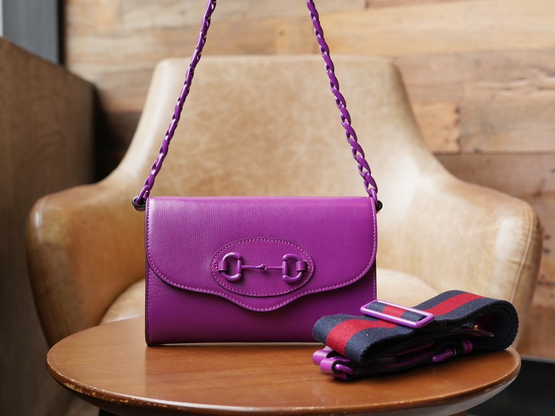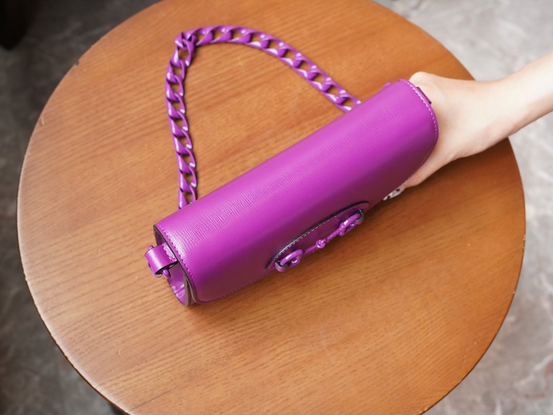 This Horsebit 1955 handbag comes with two detachable shoulder straps, one in the classic red and blue webbing design and the other in the recognizable Gucc1 chain design, which exemplifies the brand’s philosophy of practical design. The handbag is made of purple leather and decorated with the collection’s signature horsebit hardware.