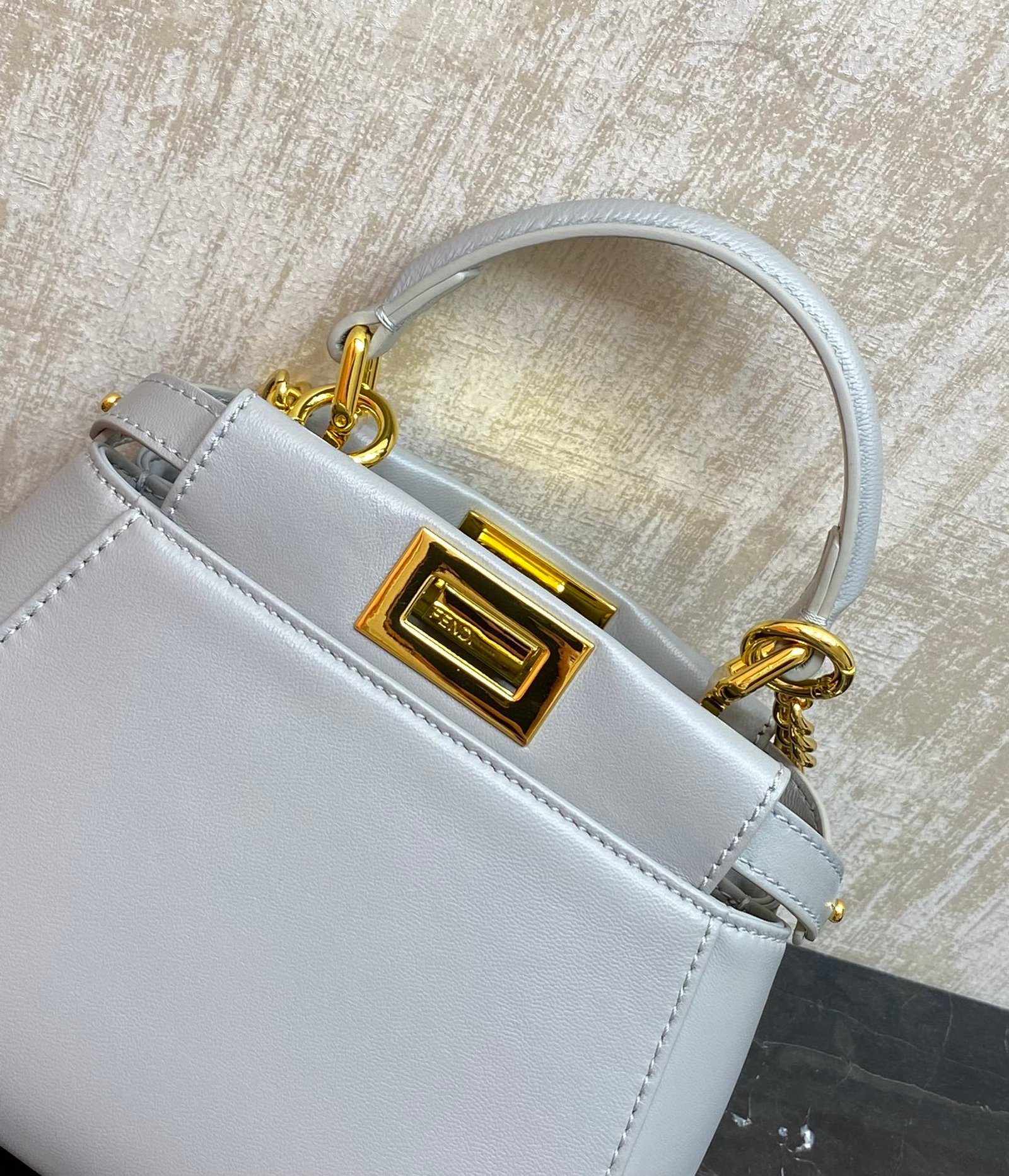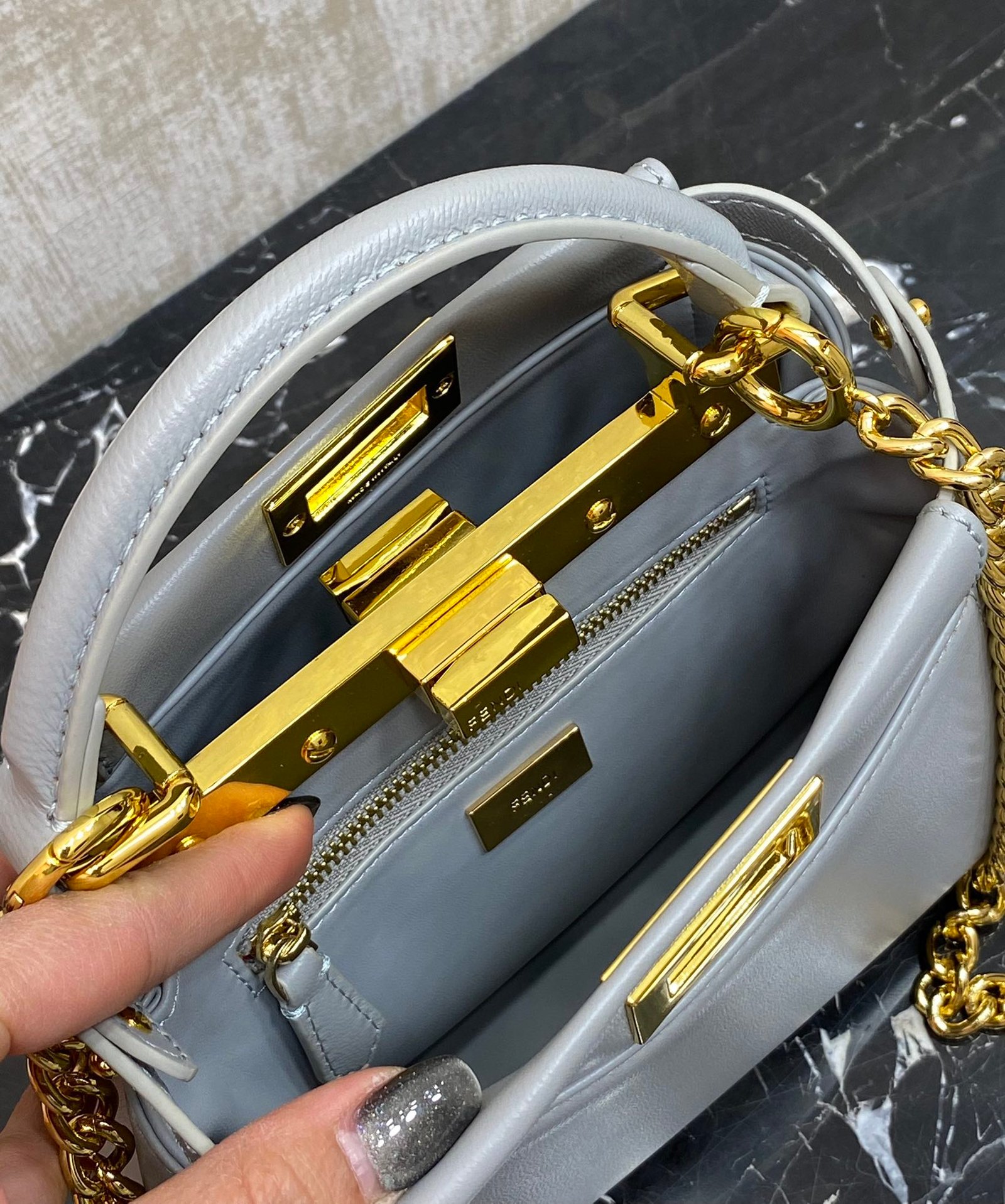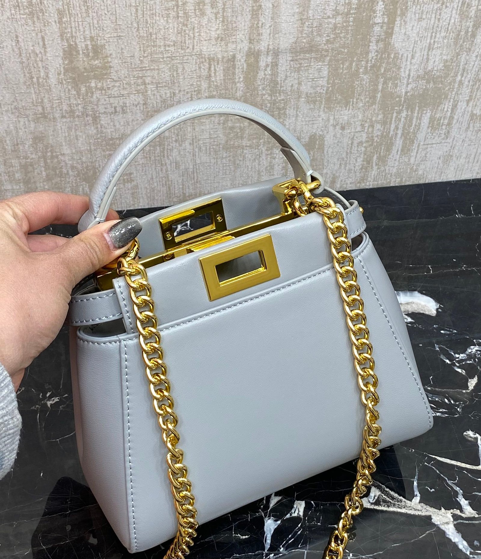 With a full set of counter packaging n light gray nPeekaboo Xs small handbag system, handbag, irreplaceable classic temperament, young fashion versatile, small bag with large capacity, star netroots with the same models, recommended, original price of 2W +, take inside and outside the washed lambskin, super fine and soft breathable and comfortable. There are each two compartments, the center is separated by a rigid plate. Twist lock on both sides. Single handle and lining. Adjustable and removable chain shoulder strap, can be carried over the shoulder or diagonally. Size 19*8.5*15.5cm ๐Ÿ๐Ÿ309 sheepskin