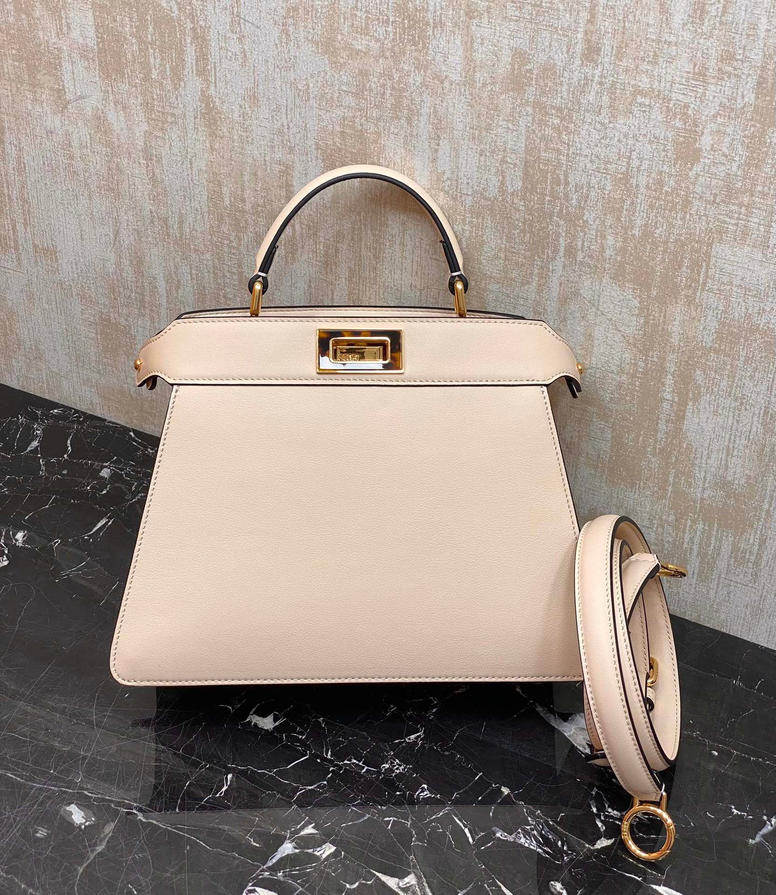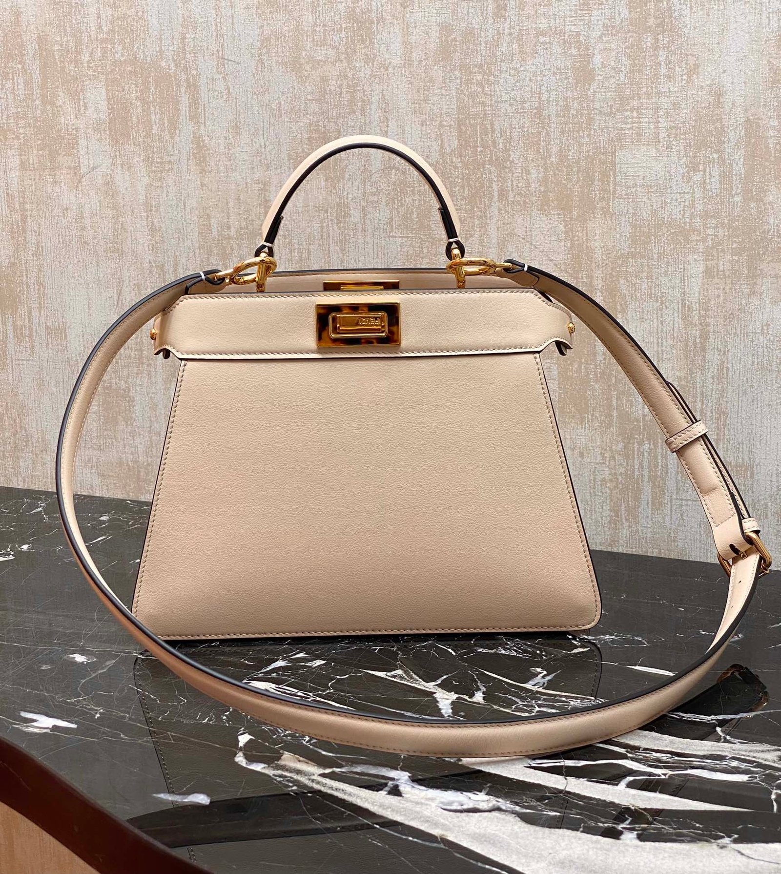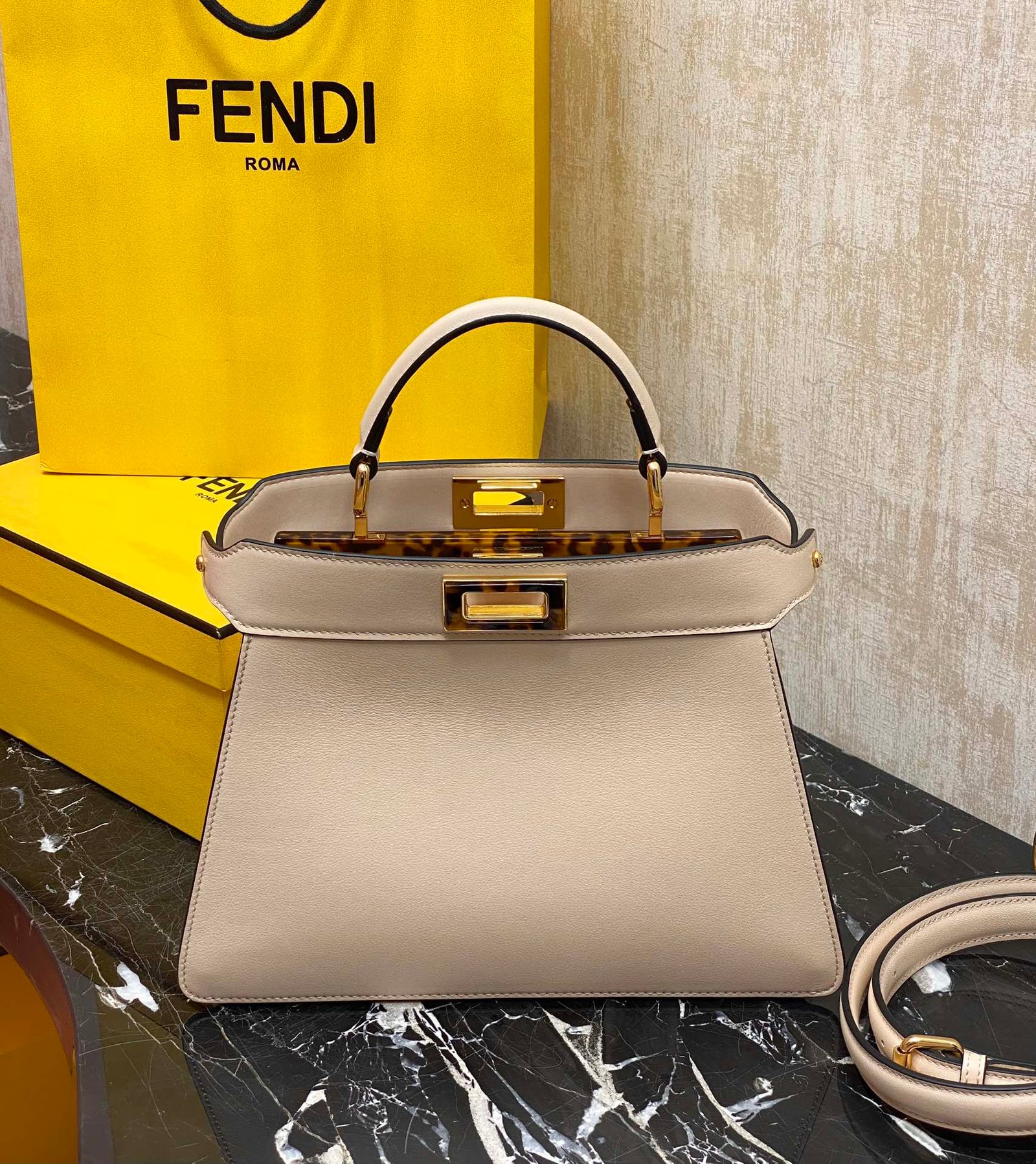 Home BAGS FENDI PeekabooISeeU medium handbag in calfskin leather, embellished with a classic twist lock on both sides, lined in soft nappa leather, with two compartments separated by a rigid divider, featuring a tie closure internal pocket and tortoiseshell and amber metal pieces. The bag comes with handles and an adjustable, detachable shoulder strap with a tortoiseshell buckle for a sophisticated and durable looknSize: 27*9.5*21cmnNo. 327Tortoiseshell and amber hardwaren